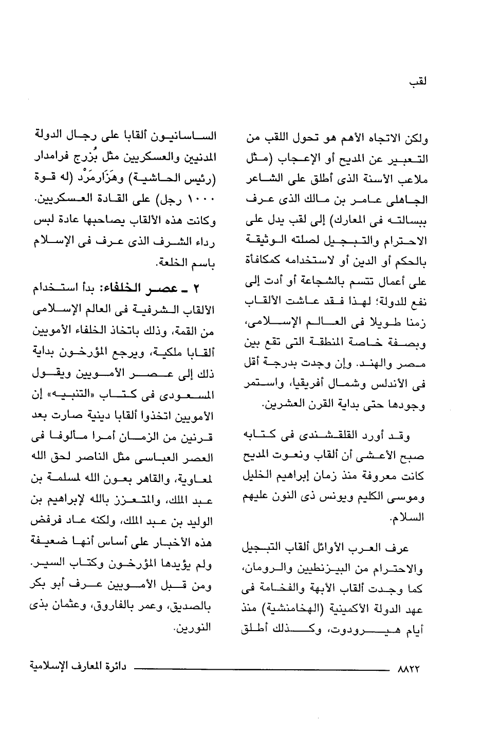 ولكن الاتجاه الأهم هو تحول اللقب من التعبير عن المديح أو الإعجاب (مثل ملاعب الأسنة الذى أطلق على الشاعر الجاهلى عامر بن مالك الذى عرف ببسالته فى المعارك) إلى لقب يدل على الاحترام والتبجيل لصلته الوثيقة بالحكم أو الدين أو لاستخدامه كمكافأة على أعمال تتسم بالشجاعة أو أدت إلى نفع للدولة؛ لهذا فقد عاشت الألقاب زمنا طويلا فى العالم الإسلامى، وبصفة خاصة المنطقة التى تقع بين مصر والهند. وإن وجدت بدرجة أقل فى الأندلس وشمال أفريقيا، واستمر وجودها حتى بداية القرن العشرين.