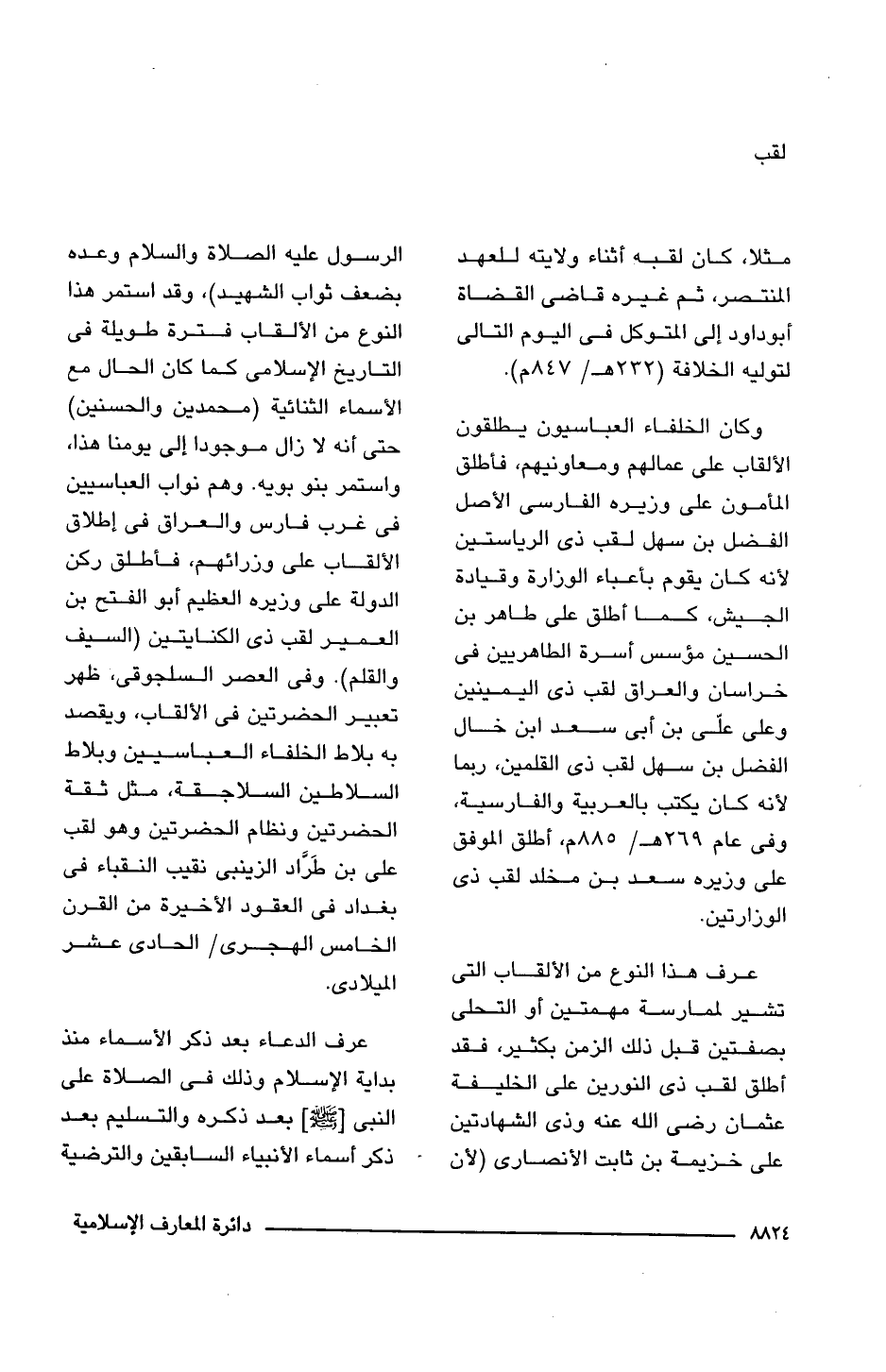 وكان الخلفاء العباسيون يطلقون الألقاب على عمالهم ومعاونيهم، فأطلق المأمون على وزيره الفارسى الأصل الفضل بن سهل لقب ذى الرياستين لأنه كان يقوم بأعباء الوزارة وقيادة الجيش، كما أطلق على طاهر بن الحسين مؤسس أسرة الطاهريين فى خراسان والعراق لقب ذى اليمينين وعلى على بن أبى سعد ابن خال الفضل بن سهل لقب ذى القلمين، ربما لأنه كان يكتب بالعربية والفارسية، وفى عام 629 هـ/ 885 م، أطلق الموفق على وزيره سعد بن مخلد لقب ذى الوزارتين.