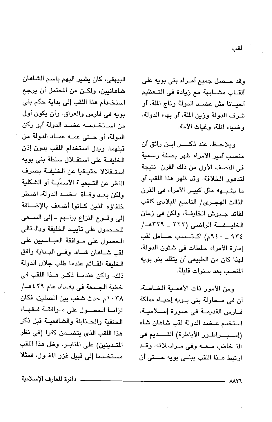 ومن الأمور ذات الأهمية الخاصة، أن فى محاولة بنى بويه إحياء مملكة فارس القديمة فى صورة إسلامية، استخدم عضد الدولة لقب شاهان شاه (إمبراطور الأباطرة) القديم فى التخاطب معه وفى مراسلاته، وقد ارتبط هذا اللقب ببنى بويه حتى أن البيهقى، كان يشير إليهم باسم الشاهان شاهانيين، ولكن من المحتمل أن يرجع أستخدام هذا اللقب إلى بداية حكم بنى بويه فى فارس والعراق. وأن يكون أول من استخدمه عضد الدولة أبو ركن الدولة، أو حتى عمه عماد الدولة من قبلهما. ويدل استخدام اللقب بدون إذن الخليفة على استقلال سلطة بنى بويه استقلالا حقيقيا عن الخليفة بصرف النظر عن التبعيه الأسمّية أو الشكلية ولكن بعد وفاة عضد الدولة، اضطر خلفاؤه الذين كانوا أضعف بالإضافة إلى وقوع النزاع بينهم -إلى السعى للحصول على تأييد الخليفة وبالتالى الحصول على موافقة العباسيين على لقب شاهان شاه. وفى البداية وافق الخليفة القائم عندما طلب جلال الدولة ذلك، ولكن عندما ذكر هذا اللقب فى خطبة الجمعة فى بغداد عام 429 هـ/ 1038 م حدث شغب بين المصلين، فكان لزاما الحصول على موافقة فقهاء الحنفية والحنابلة والشافعية قبل ذكر هذا اللقب الذى يتضمن كفرا (فى نظر المتدينين) على المنابر. وظل هذا اللقب مستخدما إلى قبيل غزو المغول، فمثلا