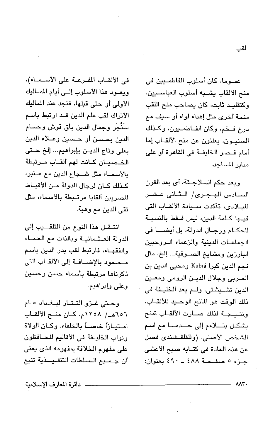 وبعد حكم السلاجقة، أى بعد القرن السادس الهجرى/ الثانى عشر الميلادى، تأكدت سيادة الألقاب التى فيها كلمة الدين، ليس فقط بالنسبة للحكام ورجال الدولة، بل أيضا فى الجماعات الدينية والزعماء الروحيين البارزين ومشايخ الصوفية. . . إلخ، مثل نجم الدين كبرا Kubra ومحيى الدين بن العربى وجلال الدين الرومى ومعين الدين تشيشتى، ولم يعد الخليفة فى ذلك الوقت هو المانح الوحيد للألقاب، ونتيجة لذلك صارت الألقاب تمنح بشكل يتلاءم إلى حد ما مع اسم الشخص الأصلى. (وللقلقشندى فصل عن هذه العادة فى كتابه صبح الأعشى جزء 5 صفحة 488 - 490 بعنوان: فى الألقاب المفرعة على الأسماء)، ويعود هذا الأسلوب إلى أيام المماليك الأولى أو حتى قبلها، فنجد عند المماليك الأتراك لقب علم الدين قد ارتبط باسم سَنْجَر وجمال الدين بأق قوش وحسام الدين بحسن أو حسين وعلاء الدين بعلى وتاج الدين بإبراهيم. . . إلخ حتى الخصيان كانت لهم ألقاب مرتبطة بالأسماء مثل شجاع الدين مع عنبر، كذلك كان لرجال الدولة من الأقباط المصريين ألقابا مرتبطة بالأسماء، مثل تقى الدين مع وهبة.