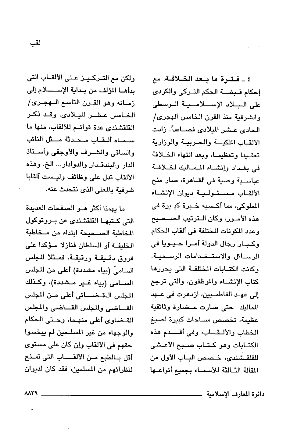 4 - فترة ما بعد الخلافة. مع إحكام قبضة الحكم التركى والكردى على البلاد الإسلامية الوسطى والشرقية منذ القرن الخامس الهجرى/ الحادى عشر الميلادى فصاعدًا. زادت الألقاب الملكية والحربية والوزارية تعقيدا وتعظيما، وبعد انتهاء الخلافة فى بغداد وإنشاء المماليك لخلافة عباسية وصية فى القاهرة، صار منح الألقاب مسئولية ديوان الإنشاء المملوكى، مما أكسبه خبرة كبيرة فى هذه الأمور، وكان الترتيب الصحيح وعدد المكونات المختلفة فى ألقاب الحكام وكبار رجال الدولة أمرا حيويا فى الرسائل والاستخدامات الرسمية. وكانت الكتابات المختلفة التى يحررها كتاب الإنشاء والموظفون، والتى ترجع إلى عهد الفاطميين، ازدهرت فى عهد المماليك حتى صارت حضارة وثائقية عظيمة، تخصص مساحات كبيرة لصيغ الخطاب والألقاب، وفى أقدم هذه الكتابات وهو كتاب صبح الأعشى للقلقشندى، خصص الباب الأول من المقالة الثالثة للأسماء بجميع أنواعها ولكن مع التركيز على الألقاب التى بدأها المؤلف من بداية الإسلام إلى زمانه وهو القرن التاسع الهجرى/ الخامس عشر الميلادى. وقد ذكر القلقشندى عدة قوائم للألقاب، منها ما سماه ألقاب محدثة مثل النائب والساقى والمشرف والأوجقى وأستاذ الدابى والبندقدار والدوادار. . . الخ. وهذه الألقاب تدل على وظائف وليست ألقابا شرفية بالمعنى الذى نتحدث عنه.