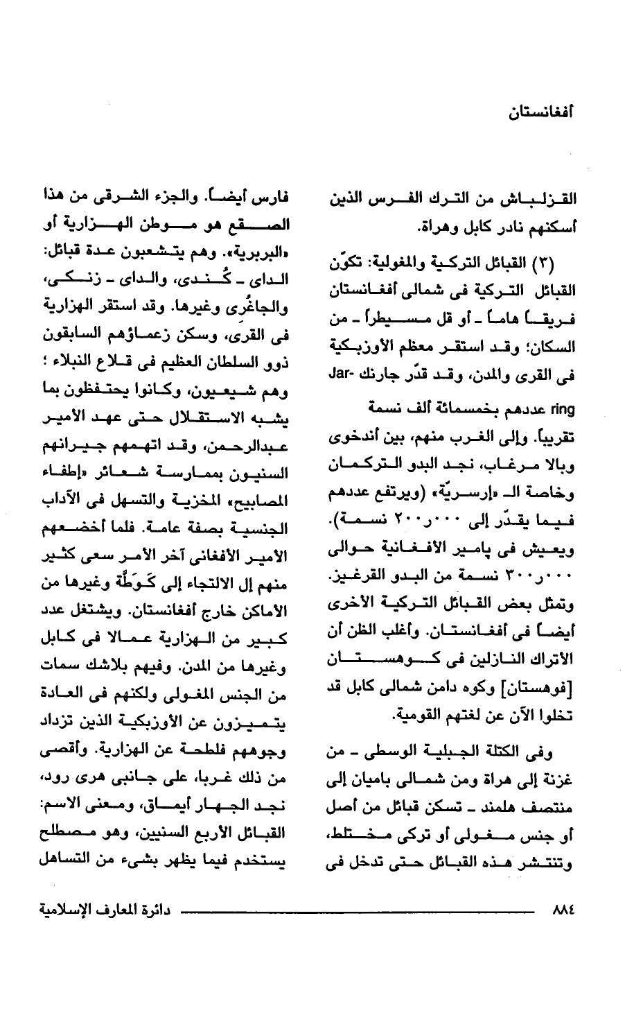 (3) القبائل التركية والمغولية: تكوّن القبائل التركية فى شمالى أفغانستان فريقًا هامًا - أو قل مسيطرًا - من السكان؛ وقد استقر معظم الأوزبكية فى القرى والمدن، وقد قدّر جارنك - Jar ring عددهم بخمسمائة ألف نسمة تقريبًا. وإلى الغرب منهم، بين أندخوى وبالا مرغاب، نجد البدو التركمان وخاصة إلى "إرسرّية" (ويرتفع عددهم فيما يقدر إلى 200.000 نسمة). ويعيش فى يامير الأفغانية حوالى 300.000 نسمة من البدو القرغيز. وتمثل بعض القبائل التركية الأخرى أيضًا فى أفغانستان. وأغلب الظن أن الأتراك النازلين فى كوهستان [فوهستان] وكوه دامن شمالى كابل قد تخلوا الآن عن لغتهم القومية.