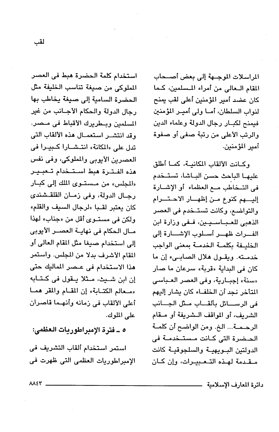 وكانت الألقاب المكانية، كما أطلق عليها البابحث حسن الباشا، تستخدم فى التخاطب مع العظماء أو الإشارة إليهم كنوع من إظهار الاحترام والتواضع، وكانت تستخدم فى العصر الذهبى للعباسيين، ففى وزارة ابن الفرات ظهر أسلوب الإشارة إلى الخليفة بكلمة الخدمة بمعنى الواجب خدمته. ويقول هلال الصابئ إن ما كان فى البداية "قربة" سرعان ما صار "سنة" إجبارية، وفى العصر العباسى المتأخر نجد أن الخلفاء كان يشار إليهم فى الرسائل بألقاب مثل الجانب الشريف، أو المواقف الشريفة أو مقام الرحمة. . . الخ. ومن الواضح أن كلمة الحضرة التى كانت مستخدمة فى الدولتين البويهية والسلجوقية كانت مقدمة لهذه التعبيرات، وإن كان استخدام كلمة الحضرة هبط فى العصر المملوكى من صيغة تناسب الخليفة مثل الحضرة السامية إلى صيغة يخاطب بها رجال الدولة والحكام الأجانب من غير المسلمين وبطريرك الأقباط فى مصر. وقد انتشر استعمال هذه الألقاب التى تدل على "المكانة" انتشارا كبيرا فى العصرين الأيوبى والمملوكى، وفى نفس هذه الفترة هبط استخدام تعبير "المجلس" من مستوى الملك إلى كبار رجال الدولة، وفى زمان القلقشندى كان يعتبر لقبا "الرجال السيف والقلم" ولكن فى مستوى أقل من "جناب" لهذا مال الحكام فى نهاية العصر الأيوبى إلى استخدام صيغا مثل المقام العالى أو المقام الأشرف بدلا من المجلس. واستمر هذا الاستخدام فى عصر المماليك حتى إن ابن شيث، مثلا يقول فى كتابه "معالم الكتابة" إن المقام والمقر هما أعلى الألقاب فى زمانه وأنهما قاصران على الملوك.