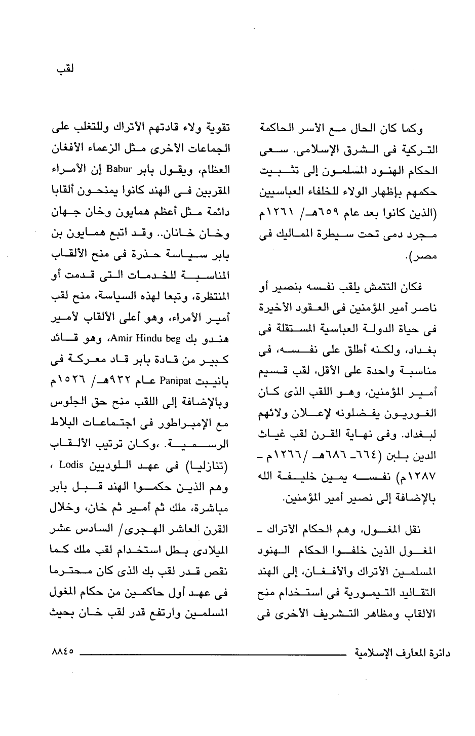 نقل المغول، وهم الحكام الأتراك- المغول الذين خلفوا الحكام الهنود المسلمين الأتراك والأفغان، إلى الهند التقاليد التيمورية فى استخدام منح الألقاب ومظاهر التشريف الأخرى فى تقوية ولاء قادتهم الأتراك وللتغلب على الجماعات الأخرى مثل الزعماء الأفغان العظام، ويقول بابر Babur إن الأمراء المقربين فى الهند كانوا يمنحون ألقابا دائمة مثل أعظم همايون وخان جهان وخان خانان. . وقد اتبع همايون بن بابر سياسة حذرة فى منح الألقاب المناسبة للخدمات التى قدمت أو المنتظرة، وتبعا لهذه السياسة، منح لقب أمير الأمراء، وهو أعلى الألقاب لأمير هندو بك Amir Hindu beg، وهو قائد كبير من قادة بابر قاد معركة فى بانيبت Panipat عام 932 هـ/ 1526 م وبالإضافة إلى اللقب منح حق الجلوس مع الإمبراطور فى اجتماعات البلاط الرسمية، وكان ترتيب الألقاب (تنازليا) فى عهد اللوديين Lodis، وهم الذين حكموا الهند قبل بابر مباشرة، ملك ثم أمير ثم خان، وخلال القرن العاشر الهجرى/ السادس عشر الميلادى بطل استخدام لقب ملك كما نقص قدر لقب بك الذى كان محترما فى عهد أول حاكمين من حكام المغول المسلمين وارتفع قدر لقب خان بحيث