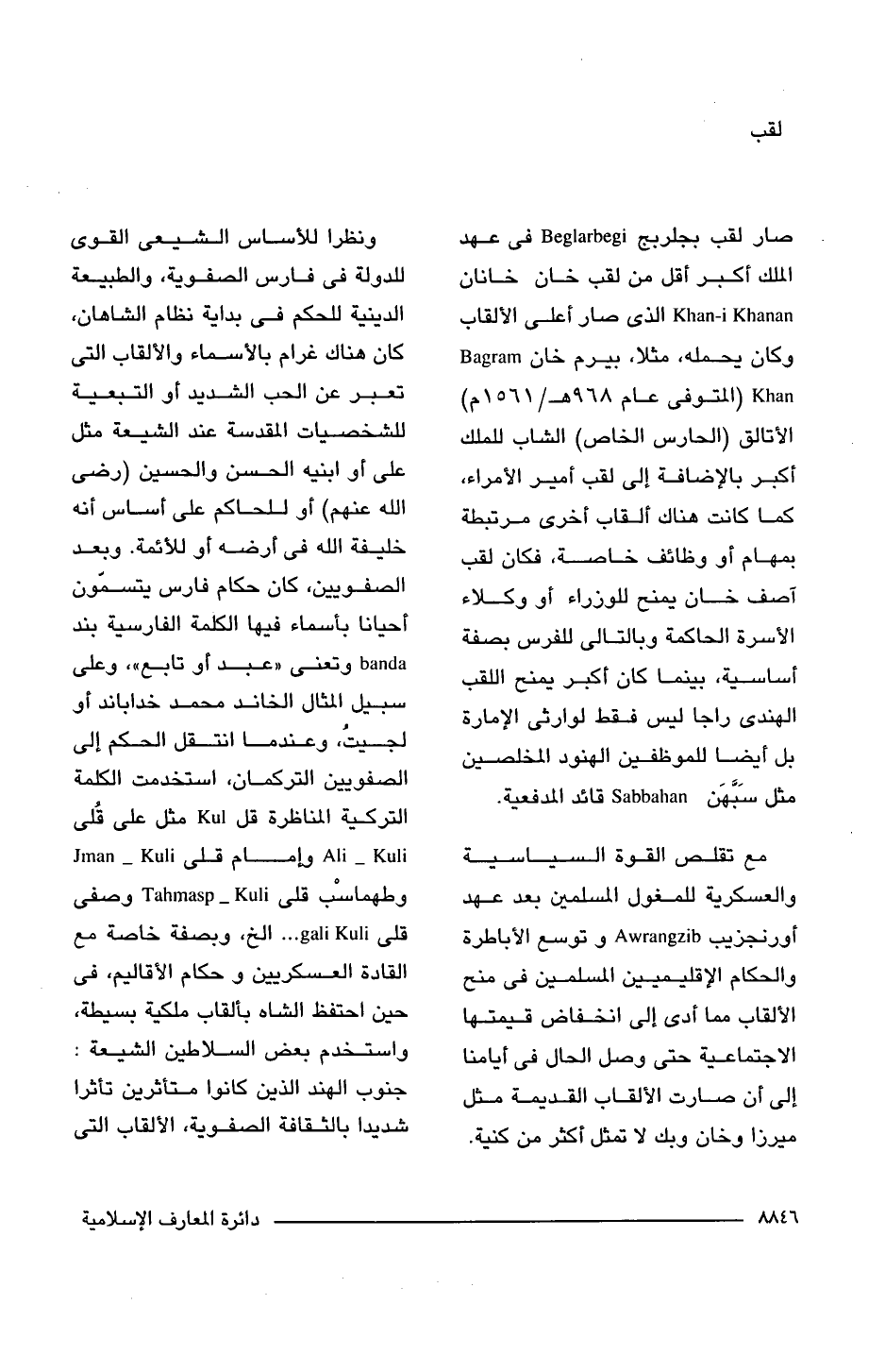 ونظرا للأساس الشيعى القوى للدولة فى فارس الصفوية، والطبيعة الدينية للحكم فى بداية نظام الشاهان، كان هناك غرام بالأسماء والألقاب التى تعبر عن الحب الشديد أو التبعية للشخصيات المقدسة عند الشيعة مثل على أو ابنيه الحسن والحسين (رضى اللَّه عنهم) أو للحاكم على أساس أنه خليفة اللَّه فى أرضه أو للأئمة. وبعد الصفويين، كان حكام فارس يتسمّون أحيانا بأسماء فيها الكلمة الفارسية بند banda وتعنى "عبد أو تابع"، وعلى سبيل المثال الخاند محمد خداباند أو لجيتُ، وعندما انتقل الحكم إلى الصفويين التركمان، استخدمت الكلمة التركية المناظرة قل Kul مثل على قُلى Ali-Kuli وإمام قلى Iman-Kuli وطهماسْب قلى Tahmasp-Kuli وصفى قلى gali Kuli . . . الخ، وبصفة خاصة مع القادة العسكريين وحكام الأقاليم، فى حين احتفظ الشاه بألقاب ملكية بسيطة، واستخدم بعض السلاطين الشيعة: جنوب الهند الذين كانوا متأثرين تأثرا شديدا بالثقافة الصفوية، الألقاب التى