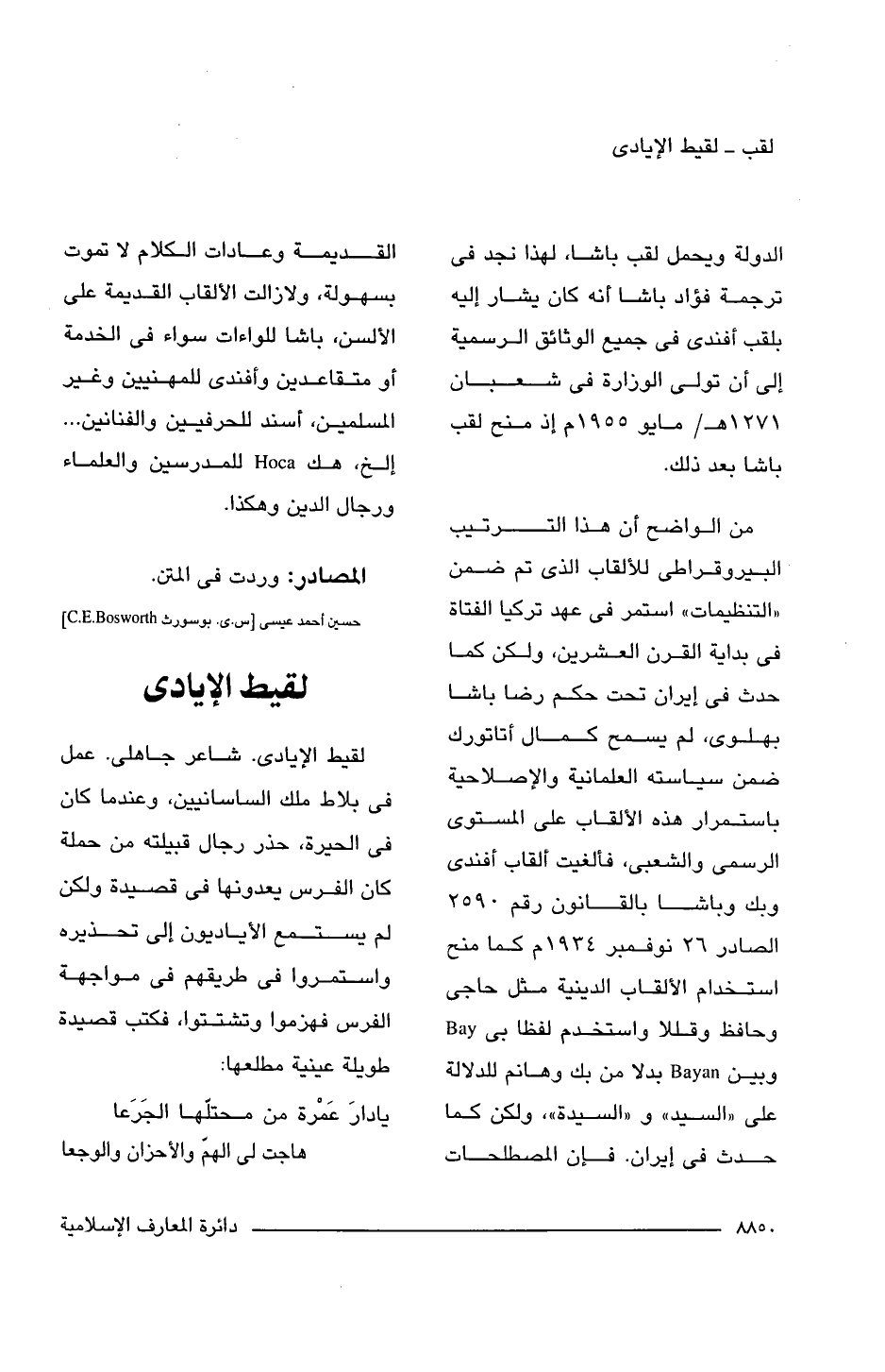 لقيط الإيادى. شاعر جاهلى. عمل فى بلاط ملك الساسانيين، وعندما كان فى الحيرة، حذر رجال قبيلته من حملة كان الفرس يعدونها فى قصيدة ولكن لم يستمع الأياديون إلى تحذيره واستمروا فى طريقهم فى مواجهة الفرس فهزموا وتشتتوا، فكتب قصيدة طويلة عينية مطلعها: