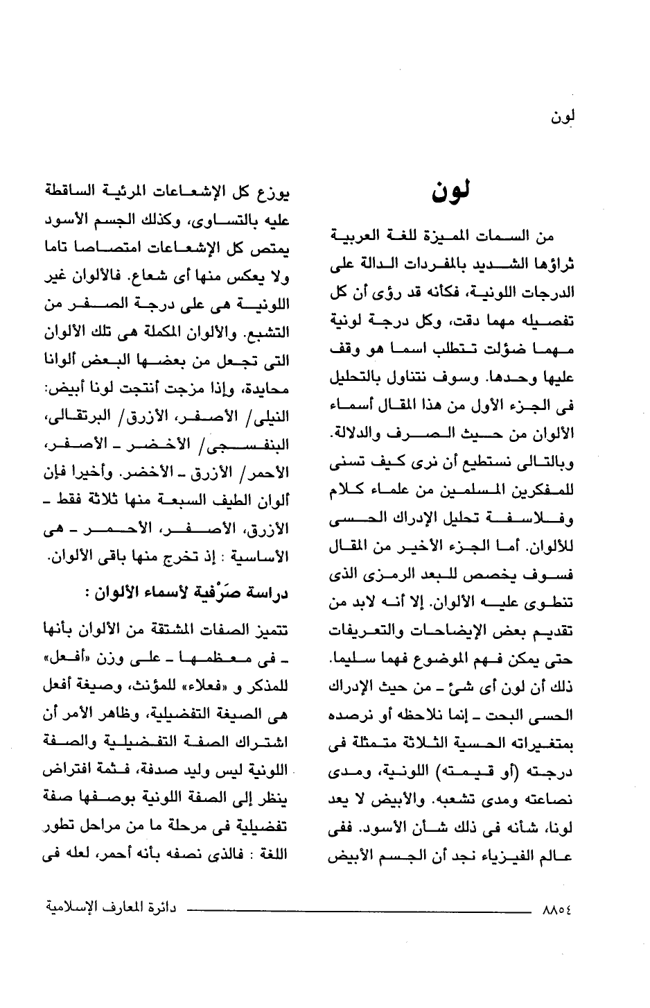 من السمات المميزة للغة العربية ثراؤها الشديد بالمفردات الدالة على الدرجات اللونية، فكانه قد رؤى أن كل تفصيله مهما دقت، وكل درجة لونية مهما ضؤلت تتطلب اسما هو وقف عليها وحدها. وسوف نتناول بالتحليل فى الجزء الأول من هذا المقال أسماء الألوان من حيث الصرف والدلالة. وبالتالى نستطيع أن نرى كيف تسنى للمفكرين المسلمين من علماء كلام وفلاسفة تحليل الإدراك الحسى للألوان. أما الجزء الأخير من المقال فسوف يخصص للبعد الرمزى الذى تنطوى عليه الألوان. إلا أنه لابد من تقديم بعض الإيضاحات والتعريفات حتى يمكن فهم الموضوع فهما سليما. ذلك أن لون أى شئ -من حيث الإدراك الحسى البحت- إنما نلاحظه أو نرصده بمتغيراته الحسية الثلاثة متمثلة فى درجته (أو قيمته) اللونية، ومدى نصاعته ومدى تشعبه. والأبيض لا يعد لونا، شأنه فى ذلك شأن الأسود. ففى عالم الفيزياء نجد أن الجسم الأبيض يوزع كل الإشعاعات المرئية الساقطة عليه بالتساوى، وكذلك الجسم الأسود يمتص كل الإشعاعات امتصاصا تاما ولا يعكس منها أى شعاع. فالألوان غير اللونية هى على درجة الصفر من التشبع. والألوان المكملة هى تلك الألوان التى تجعل من بعضها البعض ألوانا محايدة، وإذا مزجت أنتجت لونا أبيض: النيلى/ الأصفر، الأزرق/ البرتقالى، البنفسجى/ الأخضر - الأصفر، الأحمر/ الأزرق - الأخضر. وأخيرا فإن ألوان الطيف السبعة منها ثلاثة فقط -الأزرق، الأصفر، الأحمر- هى الأساسية: إذ تخرج منها باقى الألوان.