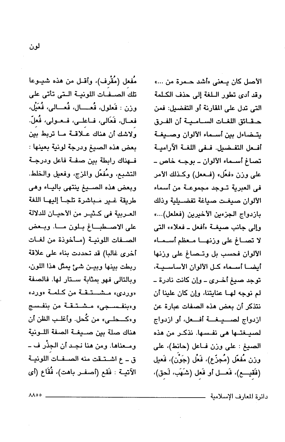 الأصل كان يعنى "أشد حمرة من. . . " وقد أدى تطور اللغة إلى حذف الكلمة التى تدل على المقارنة أو التفضيل: فمن حقائق اللغات السامية أن الفرق يتضاءل بين أسماء الألوان وصيغة أفعل التفضيل. ففى اللغة الآرامية تصاغ أسماء الألوان -بوجه خاص- على وزن "فعّل" (فععل) وكذلك الأمر فى العبرية توجد مجموعة من أسماء الألوان صيغت صياغة تفضيلية وذلك بازدواج الجزءين الأخيرين (فعلعل). . . " وإلى جانب صيغة "أفعل - فعلاء" التى لا تصاغ على وزنها معظم أسماء الألوان فحسب بل وتصاغ على وزنها أيضا أسماء كل الألوان الأساسية، توجد صيغ أخرى -وإن كانت نادرة- لم نوجه لها عنايتنا، وإن كان علينا أن نتذكر أن بعض هذه الصفات عبارة عن ازدواج لصيغة أفعل، أو ازدواج لصيغتها هى نفسها. نذكر من هذه الصيغ: على وزن فاعل (حانِط)، على وزن مُفعّل (مُجزع)، فَعْل (جَوْنَ)، فَعيل (فَقِيع)، فَعل أو فَعِل (شَهَب، لَحِق)، مُفعِل (مُقْرِف)، وأقل من هذه شيوعا تلك الصفات اللونية التى تأتى على وزن: فَعلول، فُعال، فُعالى، فُعَيْل، فِعال، فَعَالى، فاعِلى، فعولى، فُعِلّ. ولا شك أن هناك علاقة ما تربط بين بعض هذه الصيغ ودرجة لونية بعينها: فهناك رابطة بين صفة فاعل ودرجة التشبع، ومُفعّل والمزج، وفعيل والخلط. وبعض هذه الصيغ ينتهى بالياء وهى طريقة غير مباشرة تلجأ إليها اللغة العربية فى كثير من الأحيان للدلالة على الاصطباغ بلون ما. وبعض الصفات اللونية (مأخوذة من لغات أخرى غالبا) قد تحددت بناء على علاقة ربطت بينها وبين شئ يمثل هذا اللون، وبالتالى فهو بمثابة ستار لها. فالصفة "وردى" مشتقة من كلمة "ورد" و"بنفسجى" مشتقة من بنفسج و"كحلى" من كُحل. وأغلب الظن أن هناك صلة بين صيغة الصفة اللونية ومعناها. ومن هنا نجد أن الجِذْر ف - ق - ع اشتقت منه الصفات اللونية الآتية: فَقع (أصفر باهت)، فُقَاع (أى