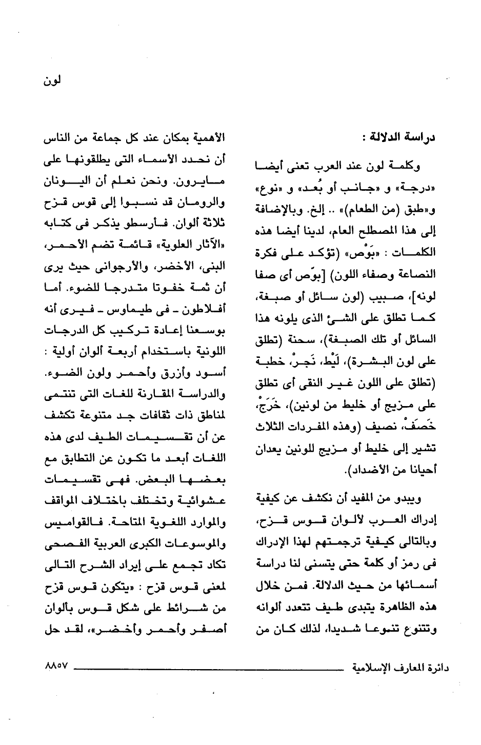ويبدو من المفيد أن نكشف عن كيفية إدراك العرب لألوان قوس قزح، وبالتالى كيفية ترجمتهم لهذا الإدراك فى رمز أو كلمة حتى يتسنى لنا دراسة أسمائها من حيث الدلالة. فمن خلال هذه الظاهرة يتبدى طيف تتعدد ألوانه وتتنوع تنوعا شديدا، لذلك كان من الأهمية بمكان عند كل جماعة من الناس أن نحدد الأسماء التى يطلقونها على ما يرون. ونحن نعلم أن اليونان والرومان قد نسبوا إلى قوس قزح ثلاثة ألوان. فارسطو يذكر فى كتابه "الآثار العلوية" قائمة تضم الأحمر، البنى، الأخضر، والأرجوانى حيث يرى أن ثمة خفوتا متدرجا للضوء. أما أفلاطون -فى طيماوس- فيرى أنه بوسعنا إعادة تركيب كل الدرجات اللونية باستخدام أربعة ألوان أولية: أسود وأزرق وأحمر ولون الضوء. والدراسة المقارنة للغات التى تنتمى لمناطق ذات ثقافات جد متنوعة تكشف عن أن تقسيمات الطيف لدى هذه اللغات أبعد ما تكون عن التطابق مع بعضها البعض. فهى تقسيمات عشوائية وتختلف باختلاف المواقف والموارد اللغوية المتاحة. فالقواميس والموسوعات الكبرى العربية الفصحى تكاد تجمع على إيراد الشرح التالى لمعنى قوس قزح: "يتكون قوس قزح من شرائط على شكل قوس بألوان أصفر وأحمر وأخضر"، لقد حل