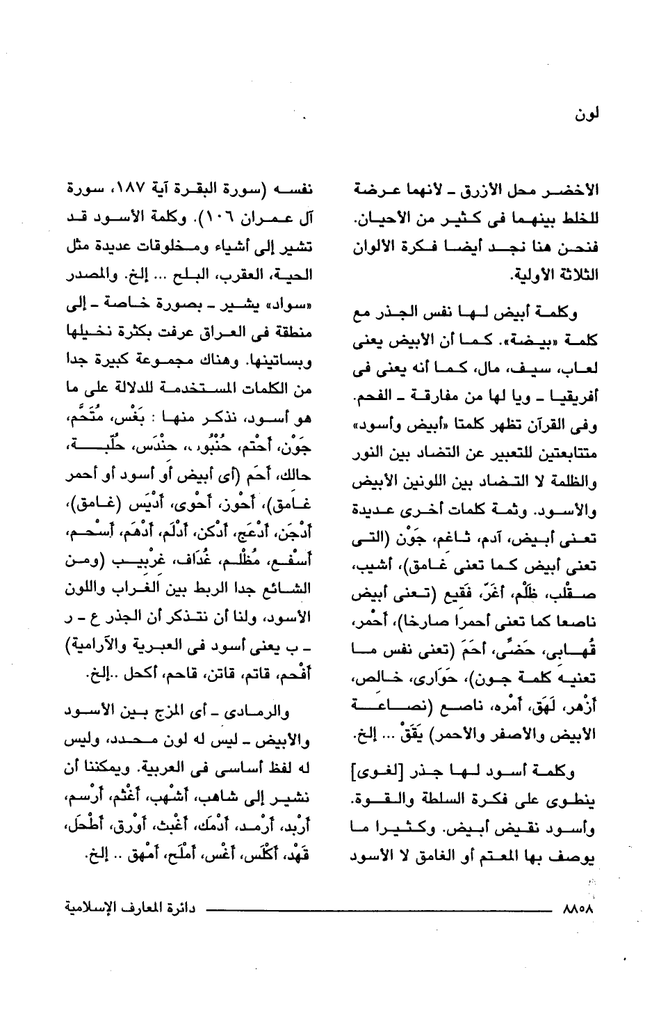 وكلمة أسود لها جذر [لغوى] ينطوى على فكرة السلطة والقوة. وأسود نقيض أبيض. وكثيرا ما يوصف بها المعتم أو الغامق لا الأسود نفسه (سورة البقرة آية 187, سورة آل عمران 106). وكلمة الأسود قد تشير إلى أشياء ومخلوقات عديدة مثل الحية، العقرب، البلح. . . إلخ. والمصدر "سواد" يشير -بصورة خاصة- إلى منطقة فى العراق عرفت بكثرة نخيلها وبساتينها. وهناك مجموعة كبيرة جدا من الكلمات المستخدمة للدلالة على ما هو أسود، نذكر منها: بَغْس، مُتَحَّم، جَوْن، أحْتم، حُنْبُوب، حنْدَس، حُلّبة، حالك، أَحَم (أى أبيض أَو أسود أو أحمر غاَمق)، أَحْوز، أَحْوى، أَدْيَس (غامق)، أَدْجَن، أَدْعَج، أَدْكن، أَدْلَم، أَدْهَم، أَسْحم، أَسْفع، مُظْلم، غُدَاف، غِرْبِيب (ومن الشائع جدا الربط بين الغراب واللون الأسود، ولنا أن نتذكر أن الجذر ع - ر - ب يعنى أسود فى العبرية والآرامية) أَفْحم، قاتم، قاتن، قاحم، أكحل. . إلخ.