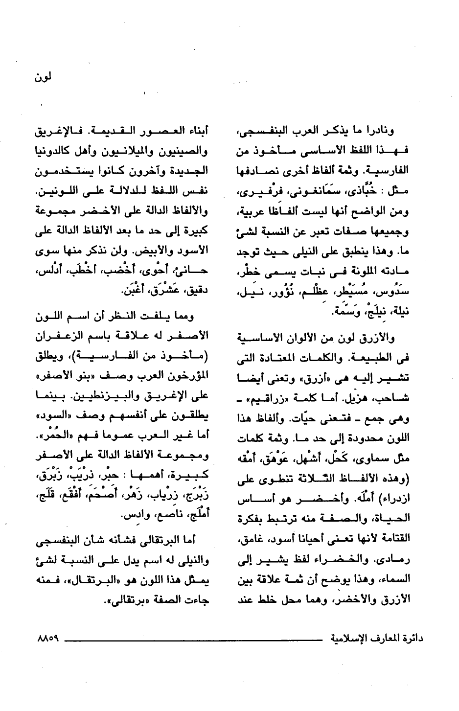 ونادرا ما يذكر العرب البنفسجى، فهذا اللفظ الأساسى مأخوذ من الفارسية. وثمة ألفاظ أخرى نصادفها مثل: خُبَّاذى، سَمَانغونى، فِرْفيرى، ومن الواضح أنها ليست ألفاظا عربية، وجميعها صفات تعبر عن النسبة لشئ ما. وهذا ينطبق على النيلى حيث توجد مادته الملونة فى نبات يسمى خِطْر، سَدُوس، مُسَيْطِر، عِظْلم، نُؤُور، نيل، نيلة، نِيلَجْ، وَسّمة.