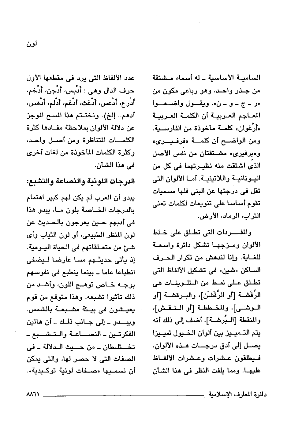 يبدو أن العرب لم يكن لهم كبير اهتمام بالدرجات الخاصة بلون ما، يبدو هذا فى أدبهم حين يعرجون بالحديث عن لون المنظر الطبيعى، أو لون الثياب وأى شئ من متعلقاتهم فى الحياة اليومية. إذ يأتى حديثهم مسا عارضا ليضفى انطباعا عاما -بينما ينطبع فى نفوسهم بوجه خاص توهج اللون، وأشد من ذلك تأثيرا تشبعه. وهذا متوقع من قوم يعيشون فى بيئة مشبعة بالشمس. ويبدو -إلى جانب ذلك- أن هاتين الفكرتين -النصاعة والتشبع- تختلطان -من حيث الدلالة- فى الصفات التى لا حصر لها، والتى يمكن أن نسميها "صفات لونية توكيدية".