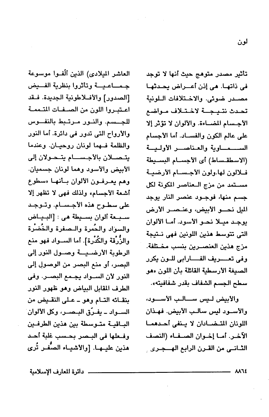 والأبيض ليس سالب الأسود، والأسود ليس سالب الأبيض. فهذان اللونان المتضادان لا ينفى أحدهما الأخر. أما إخوان الصفاء (النصف الثانى من القرن الرابع الهجرى/ العاشر الميلادى) الذين ألّفوا موسوعة جماعية وتأثروا بنظرية الفيض [الصدور] والأفلاطونية الجديدة. فقد اعتبروا اللون من الصفات المتممة للجسم. والنور مرتبط بالنفوس والأرواح التى تدور فى دائرة. أما النور والظلمة فهما لونان روحيان. وعندما يتصلان بالأجسام يتحولان إلى الأبيض والأسود وهما لونان جسميان. وهم يعرفون الألوان بأنها "سطوع أشعة الأجسام" ولذلك فهى لا تظهر إلا على سطوح هذه الأجسام. وتوجد سبعة ألوان بسيطة هى: [البياض والسواد والحُمرة والصفرة والخُضْرة والزُّرْقة والكُدْرة]. أما السواد فهو منع الرطوبة الأرضية وصول النور إلى البصر، أو منع البصر من الوصول إلى النور لأن السواد يجمع البصر. وفى الطرف المقابل البياض وهو ظهور النور بنقائه التام وهو -على النقيض من السواد- يفرّق البصر، وكل الألوان الباقية متوسطة بين هذين الطرفين وفعلها فى البصر بحسب غلبة أحد هذين عليها. أو الأشياء الصُّفر تُرى