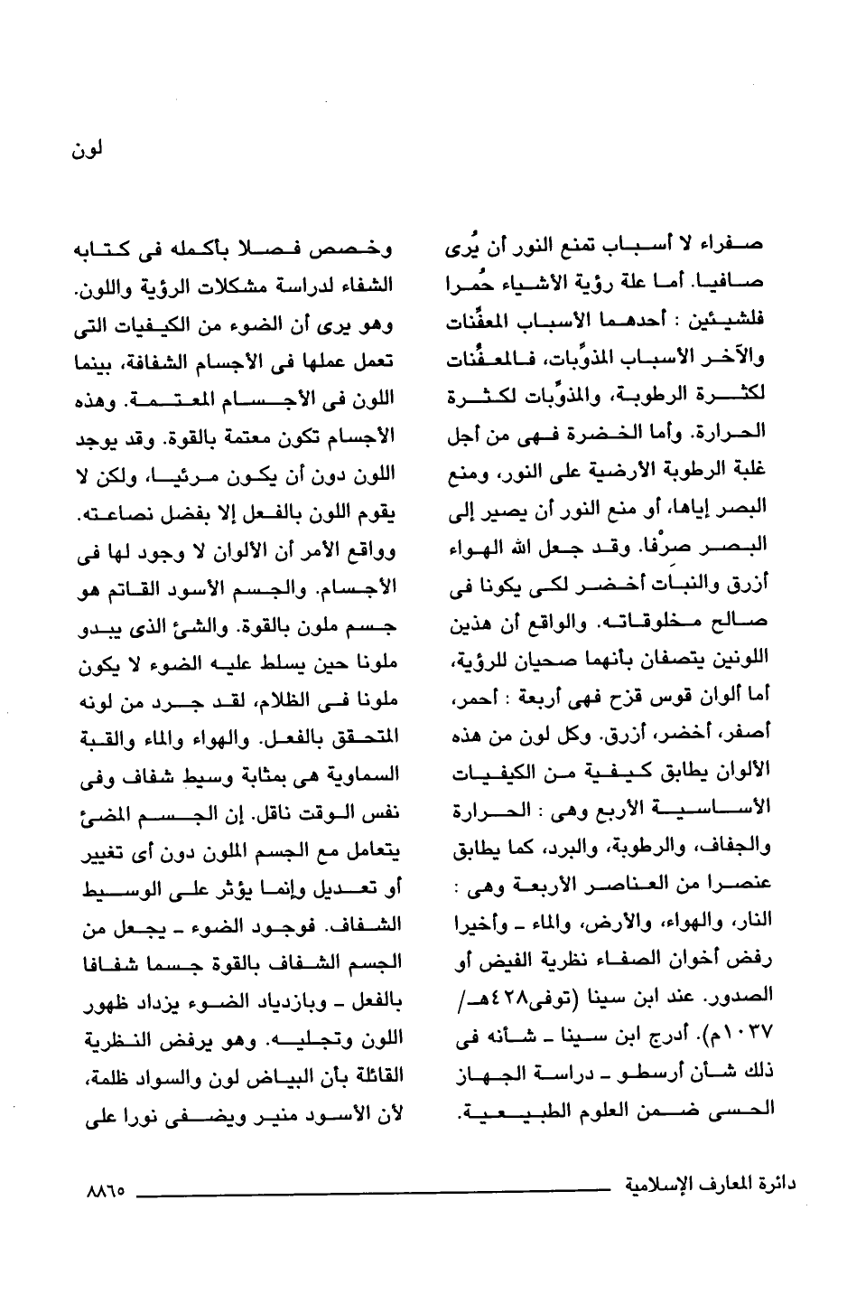 صفراء لا أسباب تمنع النور أن يُرى صافيا. أما علة رؤية الأشياء حُمرا فلشيئين: أحدهما الأسباب المعفِّنات والآخر الأسباب المذوِّبات، فالمعفِّنات لكثرة الرطوبة، والمذوِّبات لكثرة الحرارة. وأما الخضرة فهى من أجل غلبة الرطوبة الأرضية على النور، ومنع البصر إياها، أو منع النور أن يصير إلى البصر صرْفا. وقد جعل اللَّه الهواء أزرق والنبات أخضر لكى يكونا فى صالح مخلوقاته. والواقع أن هذين اللونين يتصفان بأنهما صحيان للرؤية، أما ألوان قوس قزح فهى أربعة: أحمر، أصفر، أخضر، أزرق. وكل لون من هذه الألوان يطابق كيفية من الكيفيات الأساسية الأربع وهى: الحرارة والجفاف، والرطوبة، والبرد، كما يطابق عنصرا من العناصر الأربعة وهى: النار، والهواء، والأرض، والماء -وأخيرا رفض أخوان الصفاء نظرية الفيض أو الصدور. عند ابن سينا (توفى 428 هـ/ 1037 م). أدرج ابن سينا -شأنه فى ذلك شأن أرسطو- دراسة الجهاز الحسى ضمن العلوم الطبيعية. وخصص فصلا بأكمله فى كتابه الشفاء لدراسة مشكلات الرؤية واللون. وهو يرى أن الضوء من الكيفيات التى تعمل عملها فى الأجسام الشفافة، بينما اللون فى الأجسام المعتمة. وهذه الأجسام تكون معتمة بالقوة. وقد يوجد اللون دون أن يكون مرئيا، ولكن لا يقوم اللون بالفعل إلا بفضل نصاعته. وواقع الأمر أن الألوان لا وجود لها فى الأجسام. والجسم الأسود القاتم هو جسم ملون بالقوة. والشئ الذى يبدو ملونا حين يسلط عليه الضوء لا يكون ملونا فى الظلام، لقد جرد من لونه المتحقق بالفعل. والهواء والماء والقبة السماوية هى بمثابة وسيط شفاف وفى نفس الوقت ناقل. إن الجسم المضئ يتعامل مع الجسم الملون دون أى تغيير أو تعديل وإنما يؤثر على الوسيط الشفاف. فوجود الضوء -يجعل من الجسم الشفاف بالقوة جسما شفافا بالفعل- وبإزدياد الضوء يزداد ظهور اللون وتجليه. وهو يرفض النظرية القائلة بأن البياض لون والسواد ظلمة، لأن الأسود منير ويضفى نورا على