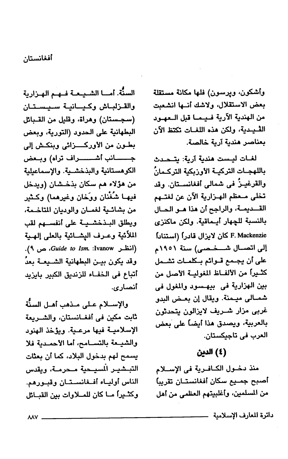 منذ دخول الكافرية فى الإسلام أصبح جميع سكان أفغانستان تقريبًا من المسلمين، وأغلبيتهم العظمى من أهل السُّنة. أما الشيعة فهم الهزارية والقزلباش وكيانية سيستان (سجستان) وهراة، وقليل من القبائل البطهانية على الحدود (التورية، وبعض بطون من الأوركزائى وبنكش إلى جانب أشراف تراه) وبعض الكوهستانية والبذخشية. والاسماعيلية من هؤلاء هم سكان بذخشان (ويدخل فيها شُغْنان ووَخان وغيرهما) وكثير من بشائية لغمان والوديان المتاخمة، ويطلق البذخشية على أنفسهم لقب الملّائية وعرف البشائية بالعلى إلهية (انظر Guide to Ism: Ivanow، ص 9). وقد يكون بين البطهانية الشيعة بعدُ أتباع فى الخفاء للزنديق الكبير بايزيد أنصارى.