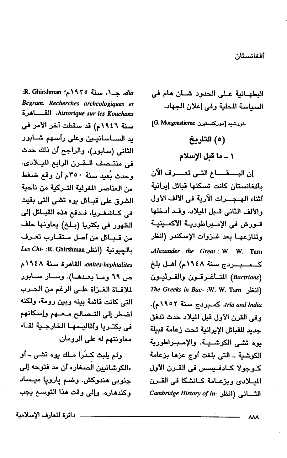 إن البقاع التى تعرف الآن بأفغانستان كانت تسكنها قبائل إيرانية أثناء الهجرات الآرية فى الألف الأول والألف الثانى قبل الميلاد، وقد أدخلها قورش فى الإمبراطورية الأكمينية وتنازعها بعد غزوات الإسكندر (انظر Alexander the Great: W. W. Tarn, كمبردج سنة 1948 م) أهل بلخ (Bactri) المتأغرقون والفرثيون (انظر The Greeks in Bac-: W. W. Tarn tria and India، كمبردج سنة 1952 م). وفى القرن الأول قبل الميلاد حدث تدفق جديد للقبائل الإيرانية تحت زعامة قبيلة يوه تشى الكوشية. والامبراطورية الكوشية - التى بلغت أوج عزها بزعامة كوجولا كادفيسس فى القرن الأول الميلادى وبزعامة كانشكا فى القرن الثانى (انظر- ln History of Cambridge dia، سنة 1935 م؛ R .Ghirshman Begram. Recherches archeologiques et historique sur les Kouchans القاهرة سنة 1946 م) قد سقطت آخر الأمر فى يد الساسانيين وعلى رأسهم شابور الثانى (سابور)، والراجح أن ذلك حدث فى منتصف القرن الرابع الميلادى. وحدث بُعيد سنة 350 م أن وقع ضغط من العناصر المغولية التركية من ناحية الشرق على قبائل يوه تشى التى بقيت فى كاشغريا، فدفع هذه القبائل الى الظهور فى بكتريا (بلخ) يعاونها حلف من قبائل من اصل متقارب تعرف بالجيونية (انظر Les Chi-: R. Ghirshman