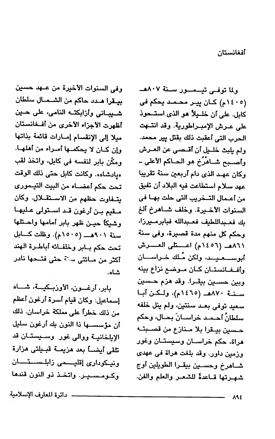 ولما توفى تيمور سنة 807 هـ (1405 م) كان بير محمد يحكم فى كابل. على لم ن خليلاً هو الذى استحوذ على عرش الامبراطورية. وقد انتهت الحرب التى لم عقبت ذلك بقتل بير محمد. ولم يلبث خليل أن أقصى عن العرش وأصبح شاهْرُخ هو الحاكم الأعلى - وكان عهد الذى دام أربعين سنة تقريبا عهد سلام استطاعت فيه البلاد أن تفيق من أعمال التخريب التى حلت بها فى السنوات الأخيرة. وخلف شاهرخ ألغ بك فعبد اللطيف فعبد الله فبابرميرزا، وحكم كل منهم مدة قصيرة، وفى سنة 861 هـ (1456 م) اعتلى العرش أبو سعيد، ولكن مُلك خراسان وأفغانستان كان موضع نزاع بينه وبين حسين بيقرا. وقد هزم حسين سنة 870 هـ (1465 م)، ولكن أبا سعيد توفى بعد سنتين، ولم ينل خلفه سلطانُ أحمد خراسانَ بحال، وحكم حسين بيقرا بلا منازع من قصبته هراة، حكم خراسان وسيستان وغور وزمين داور. وقد بلغت هراة فى عهدى شاهرخ وحسين بيقرا الطويلين اوج شهرتها قاعدة للشعر والعلم والفن.