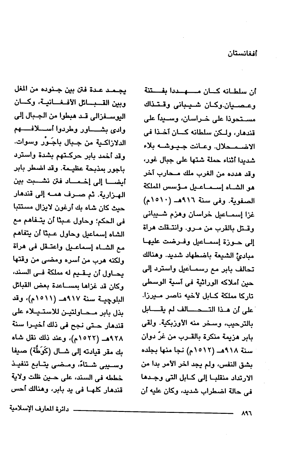أن سلطانه كان مهددا بفتنة وعصيان. وكان شيبانى وقتذاك مستحوذا على خراسان، وسيداً على قندهار، ولكن سلطانه كان آخذا فى الاضمحلال. وعانت جيوشه بلاء شديدا أثناء حملة شتها على جبال غور, وقد هدده من الغرب ملك محارب آخر هو الشاه اسماعيل مؤسس المملكة الصفوية. وفى سنة 916 هـ (1510 م) غزا إسماعيل خراسان وهزم شيبانى وقتل بالقرب من مرو. وانتقلت هراة إلى حوزة إسماعيل وفرضت عليها مبادئ الشيعة باضطهاد شديد. وهنالك تحالف بابر مع إسماعيل واسترد إلى حين أملاكه الوراثية فى آسية الوسطى تاركا مملكة كابل لأخيه ناصر ميرزا. على أن هذا التحالف لم يقابل بالترحيب، وسخر منه الأوزبكية. ولقى بابر هزيمة منكرة بالقرب من غز دوان سنة 918 هـ (1512 م) نجا منها بجلده بشق النفس، ولم يجد آخر الأمر بدا من الارتداد منقلبا إلى كابل التى وجدها فى حالة اضطراب شديد، وكان عليه أن يجمد عدة فتن بين جنوده من المغل وبين القبائل الأفغانية، وكان اليوسفزالى قد هبطوا من الجبال إلى وادى بشاور وطردوا أسلافهم الدلازاكية من جبال باجَوْر وسوات. وقد أخمد بابر حركتهم بشدة واسترد باجور بمذبحة عظيمة. وقد اضطر بابر أيضا إلى إخماد فتن نشبت بين الهزارية. ثم صرف همه إلى قندهار حيث كان شاه بك أرغون لايزال مستتبا فى الحكم؛ وحاول عبثا أن يتفاهم مع الشاه إسماعيل واعتقل فى هراة ولكنه هرب من أسره ومضى من وقتها يحاول أن يقيم له مملكة فى السند، وكان قد غزاها بمساعدة بعض القبائل البلوجية سنة 917 هـ (1511 م)، وقد بذل بابر محاولتين للاستيلاء على قندهار حتى نجح فى ذلك أخيرا سنة 928 هـ (1522 م)، وعند ذلك نقل شاه بك مقر قيادته إلى شال (كَوَطَّة) صيفا وسيبى شتاءً، ومضى يتابع تنفيذ خططه فى السند، على حين ظلت ولاية قندهار كلها فى يد بابر، وهنالك أحس