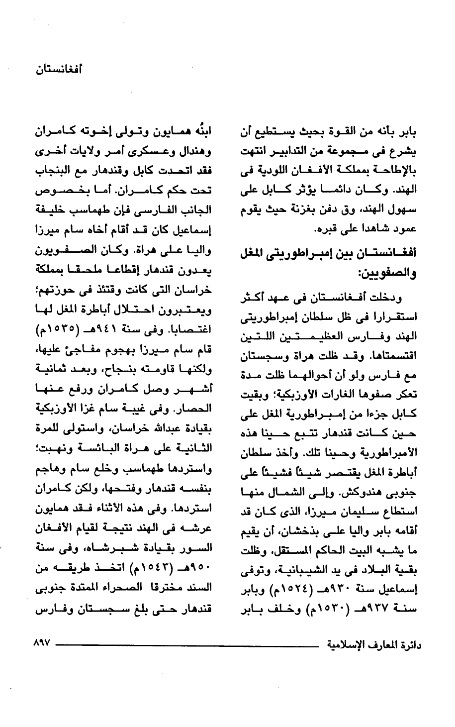 ودخلت أفغانستان فى عهد أكثر استقرارا فى ظل سلطان امبراطوريتى الهند وفارس العظيمتين اللتين اقتسمتاها. وقد ظلت هراة وسجستان مع فارس ولو أن أحوالهما ظلت مدة تعكر صفوها الغارات الأوزبكية؛ وبقيت كابل جزءا من امبراطورية المغل على حين كانت قندهار تتبع حينا هذه الأمبراطورية وحينا للك. وأخذ سلطان أباطرة المغل يقتصر شيئاً فشيئاً على جنوبى هندوكش. وإلى الشمال منها استطاع سليمان ميرزا، الذى كان قد أقامه بابر واليا على بذخشان، أن يقيم ما يشبه البيت الحاكم المستقل، وظلت بقية البلاد فى يد الشيبانية، وتوفى إسماعيل سنة 930 هـ (1524 م) وبابر سنة 937 هـ (1530 م) وخلف بابر ابنُه همايون وتولى إخوته كامران وهندال وعسكرى أمر ولايات أخرى فقد اتحدت كابل وقندهار مع البنجاب تحت حكم كامران. أما بخصوص الجانب الفارسى فإن طهماسب خليفة اسماعيل كان قد أقام أخاه سام ميرزا واليا على هراة. وكان الصفويون يعدون قندهار اقطاعا ملحقا بمملكة خراسان التى كانت وقتئذ فى حوزتهم؛ ويعتبرون احتلال أباطرة المغل لها اغتصابا. وفى سنة 931 هـ (1535 م) قام سام ميرزا بهجوم مفاجئ عليها، ولكنها قاومته بنجاح، وبعد ثمانية أشهر وصل كامران ورفع عنها الحصار. وفى غيبة سام غزا الأوزبكية بقيادة عبد الله خراسان، واستولى للمرة