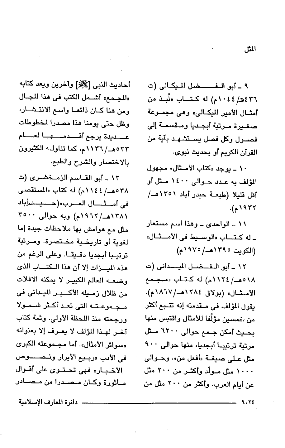 12 - أبو الفضل الميدانى (ت 518 هـ/ 1124 م) له كتاب "مجمع الأمثال" (بولاق 1284 هـ/ 1867 م). يقول المؤلف فى مقدمته إنه تتبع أكثر من خمسين مؤلَّفا للأمثال واقتبس منها بحيث أمكن جمع حوالى 6200 مثل مرتبة ترتيبًا أبجديا، منها حوالى 900 مثل على صيغة "أفعل من"، وحوالى 1000 مثل مولّد وأكثر من 200 مثل عن أيام العرب، وأكثر من 200 مثل من أحاديث النبى [-صلى اللَّه عليه وسلم-] وآخرين ويعد كتابه "المجمع" أشمل الكتب فى هذا المجال ومن هنا كان ذائعا واسع الانتشار، وظل حتى يومنا هذا مصدرًا لمخطوطات عديدة يرجع أقدمها لعام 533 هـ/ 1136 م، كما تناوله الكثيرون بالاختصار والشرح والطبع.