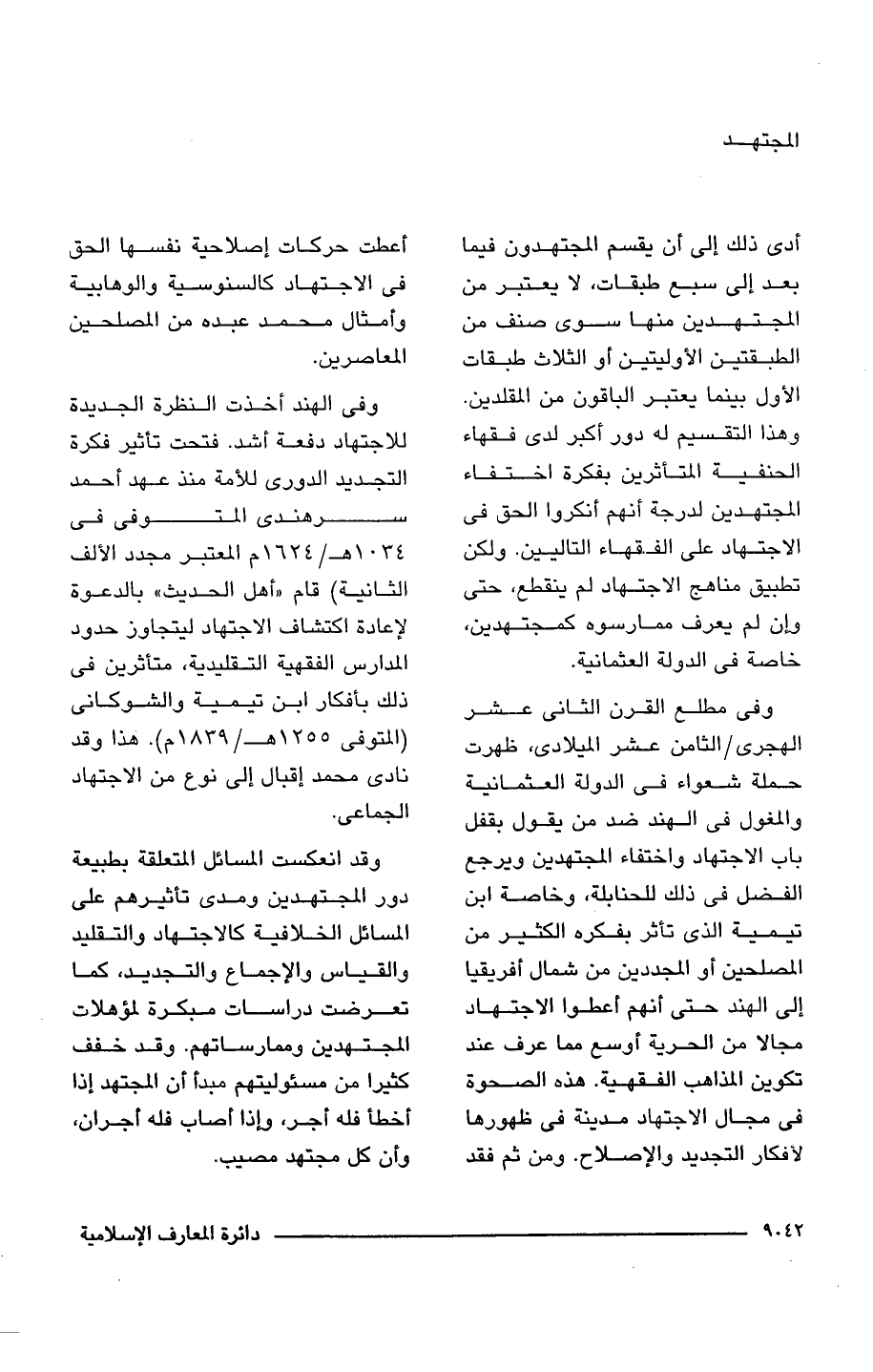 وفى الهند أخذت النظرة الجديدة للاجتهاد دفعة أشد. فتحت تأثير فكرة التجديد الدورى للأمة منذ عهد أحمد سرهندى المتوفى فى 1034 هـ/ 1624 م المعتبر مجدد الألف الثانية) قام "أهل الحديث" بالدعوة لإعادة اكتشاف الاجتهاد ليتجاوز حدود المدارس الفقهية التقليدية، متأثرين فى ذلك بأفكار ابن تيمية والشوكانى (المتوفى 1255 هـ/ 1839 م). هذا وقد نادى محمد إقبال إلى نوع من الاجتهاد الجماعى.