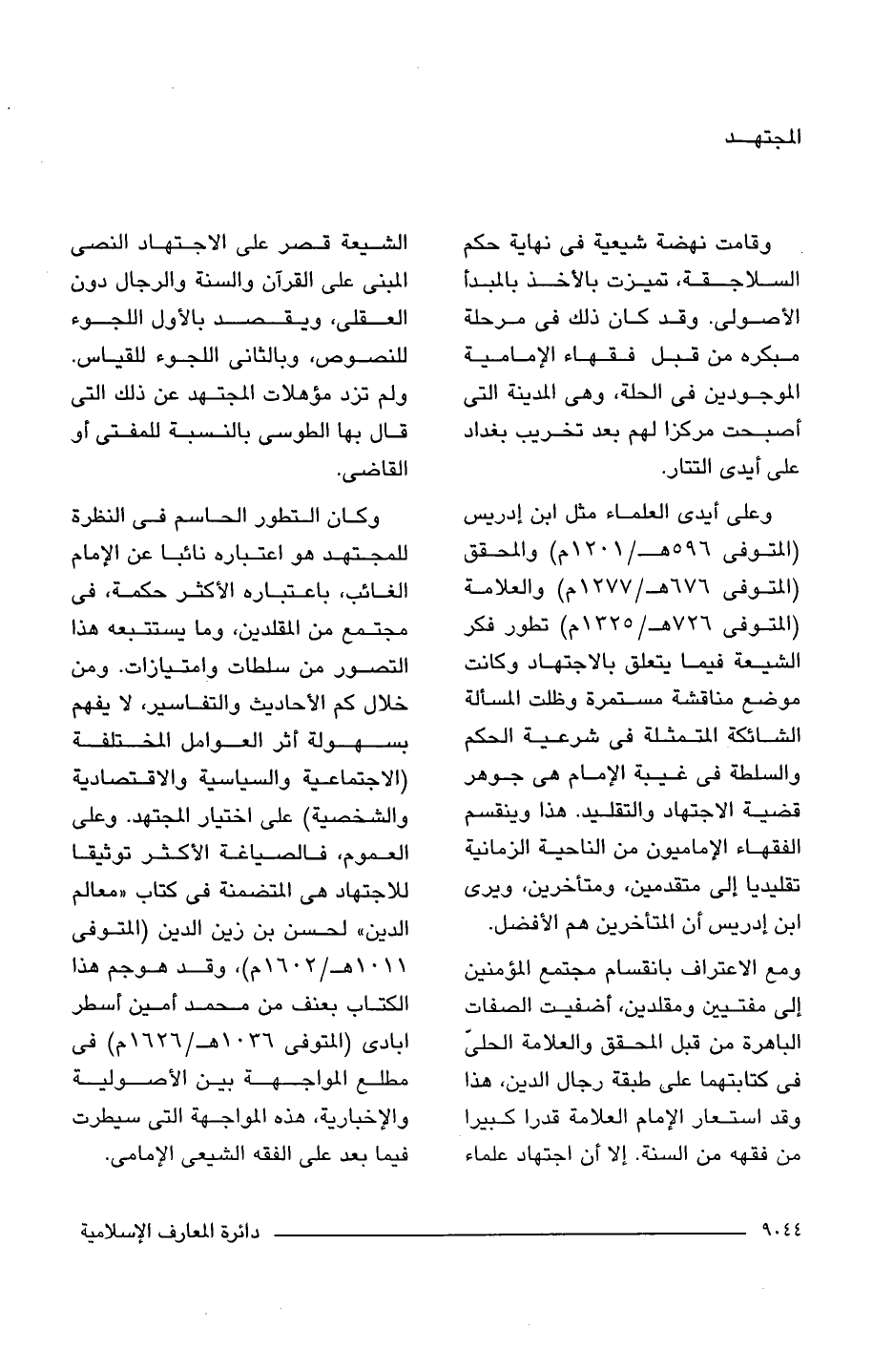 ومع الاعتراف بانقسام مجتمع المؤمنين إلى مفتيين ومقلدين، أضفيت الصفات الباهرة من قبل المحقق والعلامة الحلى فى كتابتهما على طبقة رجال الدين، هذا وقد استعار الإمام العلامة قدرًا كبيرًا من فقهه من السنة. إلا أن اجتهاد علماء الشيعة قصر على الاجتهاد النصى المبنى على القرآن والسنة والرجال دون العقلى، ويقصد بالأول اللجوء للنصوص، وبالثانى اللجوء للقياس. ولم تزد مؤهلات المجتهد عن ذلك التى قال بها الطوسى بالنسبة للمفتى أو القاضى.