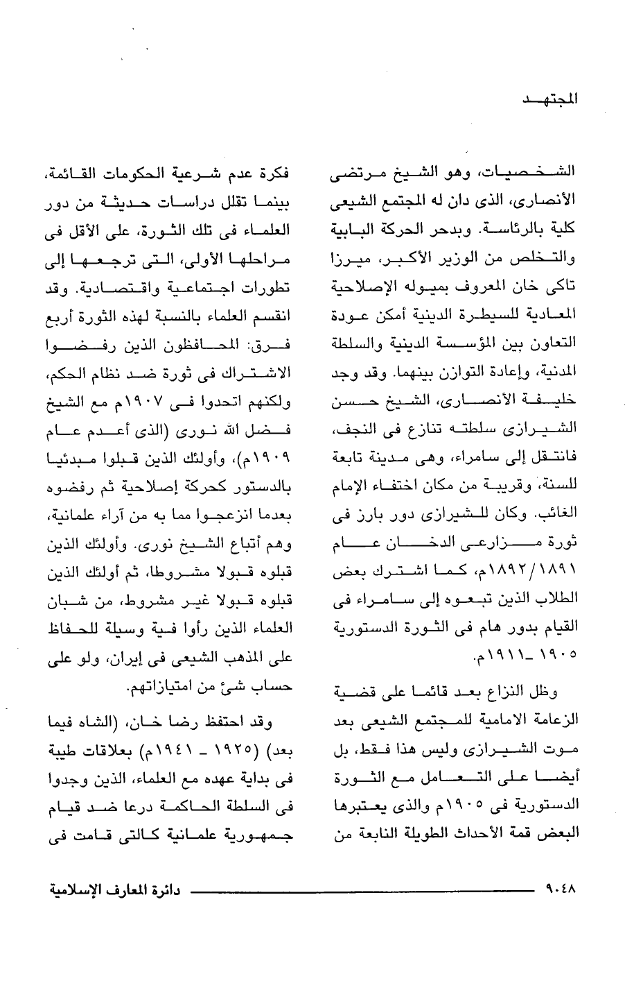 الشخصيات، وهو الشيخ مرتضى الأنصارى، الذى دان له المجتمع الشيعى كلية بالرئاسة. وبدحر الحركة البابية والتخلص من الوزير الأكبر، ميرزا تاكى خان المعروف بميوله الإصلاحية المعادية للسيطرة الدينية أمكن عودة التعاون بين المؤسسة الدينية والسلطة المدنية، وإعادة التوازن بينهما. وقد وجد خليفة الأنصارى، الشيخ حسن الشيرازى سلطته تنازع فى النجف، فانتقل إلى سامراء، وهى مدينة متابعة للسنة، وقريبة من مكان اختفاء الإمام الغائب. وكان للشيرازى دور بارز فى ثورة مزارعى الدخان عام 1891/ 1892 م، كما اشترك بعض الطلاب الذين تبعوه إلى سامراء فى القيام بدور هام فى الثورة الدستورية 1905 - 1911 م.