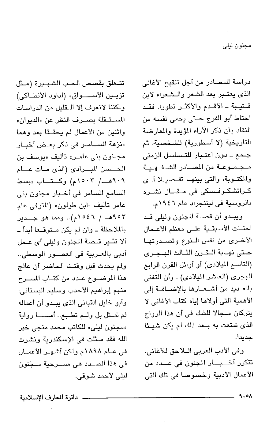 ويبدو أن قصة المجنون وليلى قد احتلت الأسبقية على معظم الأعمال الأخرى من نفس النوع وتصدرتها حتى نهاية القرن الثالث الهجرى (التاسع الميلادى) أو أوائل القرن الرابع الهجرى (العاشر الميلادى). . وأن التغنى بالعديد من أشعارها بالإضافة إلى الأهمية التى أولاها إياه كتاب الأغانى لا يتركان مجالا للشك فى أن هذا الرواج الذى تمتعت به بعد ذلك لم يكن شيئًا جديدا.