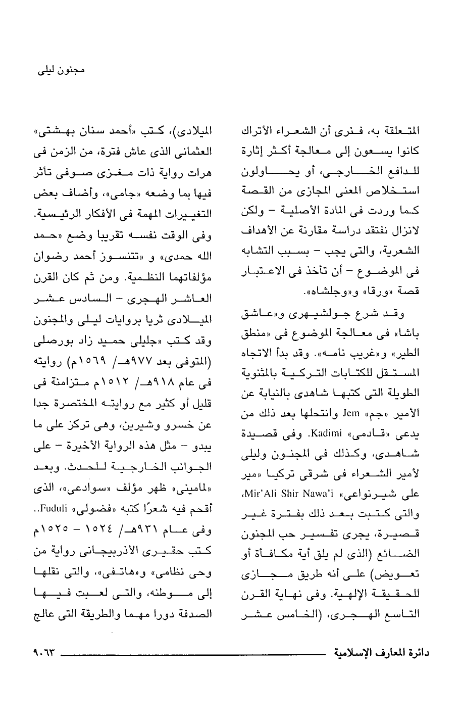 وقد شرع جولشيهرى و"عاشق باشا" فى معالجة الموضوع فى "منطق الطير" و"غريب نامه". وقد بدأ الاتجاه المستقل للكتابات التركية بالمثنوية الطويلة التى كتبها شاهدى بالنيابة عن الأمير "جم" Jem وانتحلها بعد ذلك من يدعى "قادمى" Kadimi. وفى قصيدة شاهدى، وكذلك فى المجنون وليلى لأمير الشعراء فى شرقى تركيا "مير على شيرنواعى" Mir'Ali Shir Nawa'i, والتى كتبت بعد ذلك بفترد غير قصيرة، يجرى تفسير حب المجنون الضائع (الذى لم يلق أية مكافأة أو تعويض) على أنه طريق مجازى للحقيقة الإلهية. وفى نهاية القرن التاسع الهجرى، (الخامس عشر الميلادى)، كتب "أحمد سنان بهشتى" العثمانى الذى عاش فترة، من الزمن فى هرات رواية ذات مغزى صوفى تأثر فيها بما وضعه "جامى"، وأضاف بعض التغييرات المهمة فى الأفكار الرئيسية. وفى الوقت نفسه تقريبًا وضع "حمد اللَّه حمدى" و"تتنسوز أحمد رضوان مؤلفاتهما النظمية. ومن ثم كان القرن العاشر الهجرى - السادس عشر الميلادى ثريا بروايات ليلى والمجنون وقد كتب "جليلى حميد زاد بورصلى (المتوفى بعد 977 هـ/ 1569 م) روايته فى عام 918 هـ/ 1512 م متزامنة فى قليل أو كثير مع روايته المختصرة جدا عن خسرو وشيرين، وهى تركز على ما يبدو -مثل هذه الرواية الأخيرة- على الجوانب الخارجية للحديث. وبعد "لمامينى" ظهر مؤلف "سوادعى"، الذى أقحم فيه شعرًا كتبه "فضولى" Fuduli . . وفى عام 931 هـ/ 1524 - 1525 م كتب حقيرى الأذربيجانى رواية من وحى "نظامى" و"هاتفى"، والتى نقلها إلى موطنه، والتى لعبت فيها الصدفة دورا مهما والطريقة التى عالج