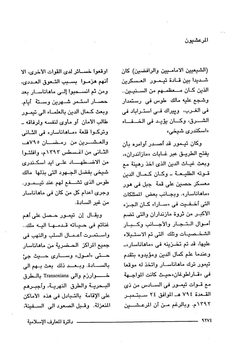 وكان تيمور قد أصدر أوامره بأن يفتح الطريق عبر غابات "مازاندران"، وبعث غياث الدين الذى أخذ رهينة مع قوته الطليعة -وكان كمال الدين معسكر حصين على قمة جبل فى هور "ماهاناسار". وبجانب بعض الممتلكات التى أخفيت فى "سارا" كان الجزء الأكبر من ثروة مازنداران والتى تضم أموال التجار والأجانب وكبار الشخصيات وتلك التى تم الاستيلاء عليها، قد تم تخزينه فى "ماهاناسار"- وعندما علم كمال الدين ومؤيدوه بتقدم تيمور ترك ماهاناسار واتخذ له موقعا فى "قاراطوغان" حيث كانت المواجهة مع قوات تيمور فى السادس من ذى القعدة 794 هـ الموافق 24 سبتمبر 1392 م. وبالرغم من أن المرعشين اوقعوا خسائر لدى القوات الأخرى، إلا أنهم هزموا بسبب التعوق العددى، ومن ثم انسحبوا إلى ماهاناسار بعد حصار استمر شهرين وستة أيام. وبعث كمال الدين بالعلماء إلى تيمور طالب الأمان أو مأوى لنفسه ولرفاقه- وتركوا قلعة "ماهاناسار" فى الثانى والعشرين من رمضان 795 هـ، الثانى من اغسطس 1393 م، وافلتوا من الاضطهاد على ايد اسكندرى شيخى بفضل الجهود التى بذلها مالك طوس الذى تشفع لهم عند تيمور. وجرى اعدام كل من كان فى ماهاناسار من غير السادة.