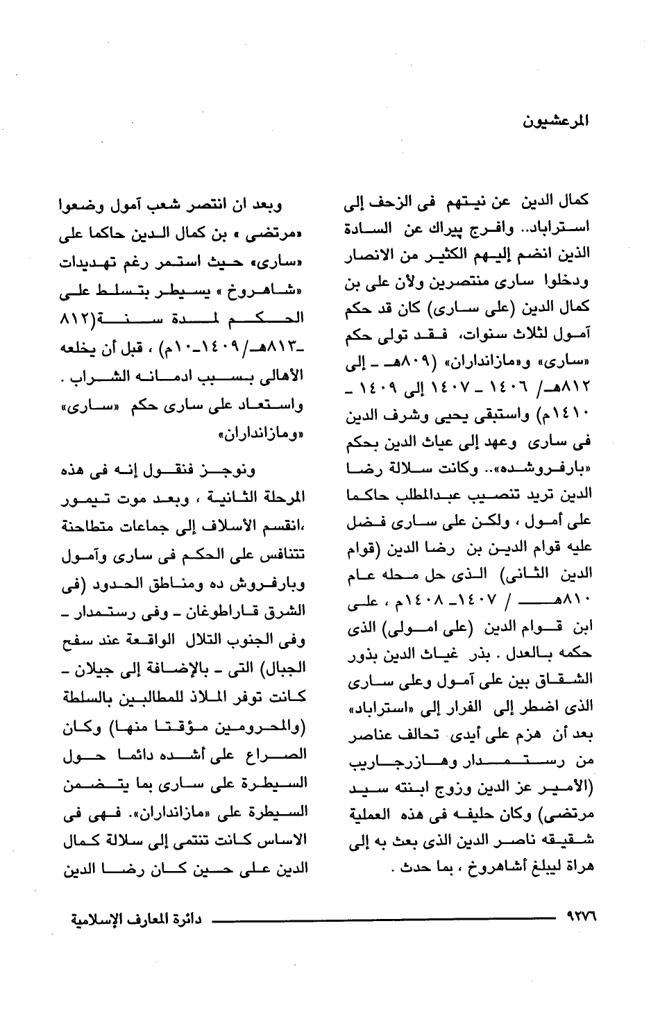 ونوجز فنقول إنه فى هذه المرحلة الثانية، وبعد موت تيمور، انقسم الأسلاف إلى جماعات متطاحنة تتنافس على الحكم فى سارى وآمول وبارفروش ده ومناطق الحدود (فى الشرق قاراطوغان -وفى رستمدار- وفى الجنوب التلال الواقعة عند سفح الجبال) التى -بالإضافة إلى جيلان- كانت توفر الملاذ للمطالبين بالسلطة (والمحرومين مؤقتا منها) وكان الصراع على أشده دائما حول السيطرة على سارى بما يتضمن السيطرة على "مازانداران". فهى فى الاساس كانت تنتمى إلى سلالة كمال الدين على حين كان رضا الدين