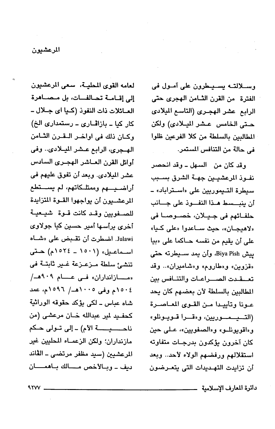 وقد كان من السهل -وقد انحصر نفوذ المرعشيين جهة الشرق بسبب سيطرة التيموريين على "استراباد"- أن ينبسط هذا النفوذ على جانب حلفائهم فى جيلان، خصوصا فى "لاهيجان"، حيث ساعدوا "على كيا" على أن يقيم من نفسه حاكما على "بيا بيش Biya Pish, وأن يمد سيطرته حتى "قزوين" و"طاروم" و"شاميران". . وقد تعقدت الصراعات والتنافس بين المطالبين بالسلطة لأن بعضهم كان يحد عونا وتأييدا من القوى المعاصرة (التيموريين، و"قرا قويونلو" و"اقويونلو" و"الصفويين"، على حين كان آخرون يؤكدون بدرجات متفاوته استقلالهم ورفضهم الولاء لأحد. . وبعد أن تزايدت التهديدات التى يتعرضون لعامة القوى المحلية، سعى المرعشيون إلى إقامة تحالفات، بل مصاهرة العائلات ذات النفوذ (كيا أى جلال - كاركيا - بازافارى - رستمدارى الخ) وكان ذلك فى أواخر القرن الثامن الهجرى، الرابع عشر الميلادى. . وفى أوائل القرن العاشر الهجرى السادس عشر الميلادى. وبعد أن تفوق عليهم فى أراضيهم وممتلكاتهم، لم يستطع المرعشيون أن يواجهوا القوة المتزايدة للصفويين وقد كانت قوة شيعية أخرى يرأسها أمير حسين كيا جولاوى Julawi. اضطرت أن تقبض على "شاه إسماعيل" (1501 - 1524 م) حتى تنشئ سلطة مزعزعة غير ثابتة فى "مازانداران" فى عام 909 هـ/ 1504 م وفى 1005 هـ/ 1596 م، عمد شاه عباس -لكى يؤكد حقوقه الوراثية كحفيد لمير عبد اللَّه خان مرعشى (من ناحية الأم) - إلى تولى حكم مازنداران؛ ولكن الزعماء المحليين غير المرعشيين (سيد مظفر مرتضى - الفاند ديف - وبالأخص مالك باهمان