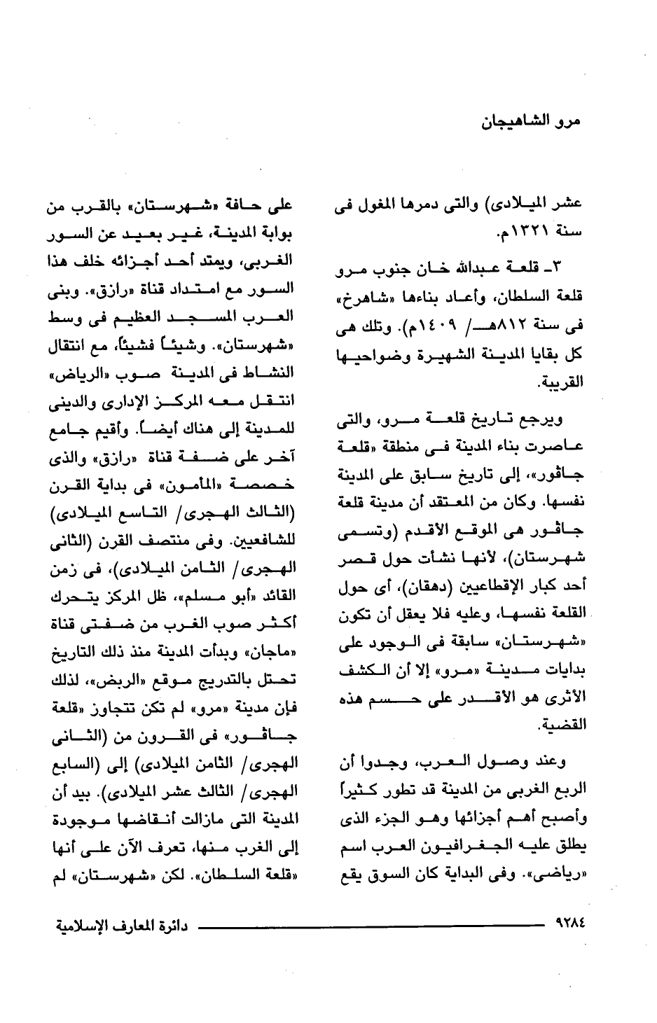 3 - قلعة عبد اللَّه خان جنوب مرو قلعة السلطان، وأعاد بناءها "شاهرخ" فى سنة (812 هـ/ 1409 م). وتلك هى كل بقايا المدينة الشهيرة وضواحيها القريبة.