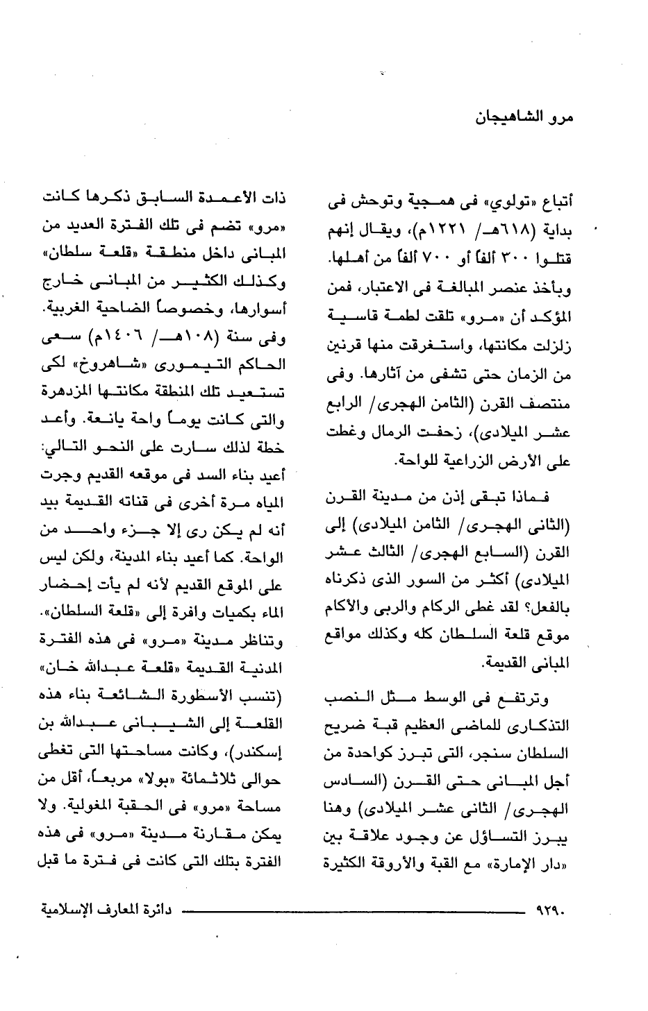 أتباع "تولوى" فى همجية وتوحش فى بداية (618 هـ/ 1221 م)، ويقال إنهم قتلوا 300 ألفا أو 700 ألفًا من أهلها. وبأخذ عنصر المبالغة فى الاعتبار، فمن المؤكد أن "مرو" تلقت لطمة قاسية زلزلت مكانتها، واستغرقت منها قرنين من الزمان حتى تشفى من آثارها. وفى منتصف القرن (الثامن الهجرى/ الرابع عشر الميلادى)، زحفت الرمال وغطت على الأرض الزراعية للواحة.