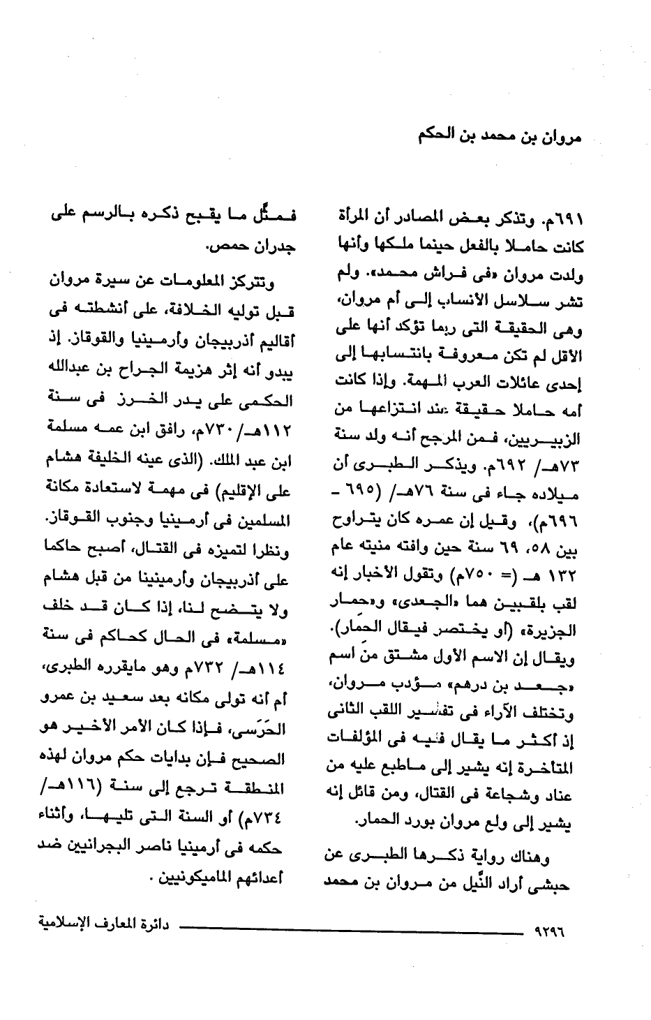 691 م. وتذكر بعض المصادر أن المرأة كانت حاملا بالفعل حينما ملكها وأنها ولدت مروان "فى فراش محمد". ولم تشر سلاسل الأنساب إلى أم مروان، وهى الحقيقة التى ربما تؤكد أنها على الأقل لم تكن معروفة بانتسابها إلى إحدى عائلات العرب المهمة. وإذا كانت أمه حاملا حقيقة عند انتزاعها من الزبيريين، فمن المرجح أنه ولد سنة 73 هـ/ 692 م. ويذكر الطبرى أن ميلاده جاء فى سنة 76 هـ (695 - 696 م)، وقيل إن عمره كان يتراوح بين 58، 69 سنة حين وافته منيته عام 132 هـ (= 570 م) وتقول الأخبار إنه لقب بلقبين هما "الجعدى" و"حمار الجزيرة" (أو يختصر فيقال الحِمَار). ويقال إن الاسم الأول مشتق من اسم "جعد بن درهم" مؤدب مروان، وتختلف الآراء فى تفسير اللقب الثانى إذ أكثر ما يقال فيه فى المؤلفات المتأخرة إنه يشير إلى ما طبع عليه من عناد وشجاعة فى القتال، ومن قائل إنه يشير إلى ولع مروان بورد الحمار.