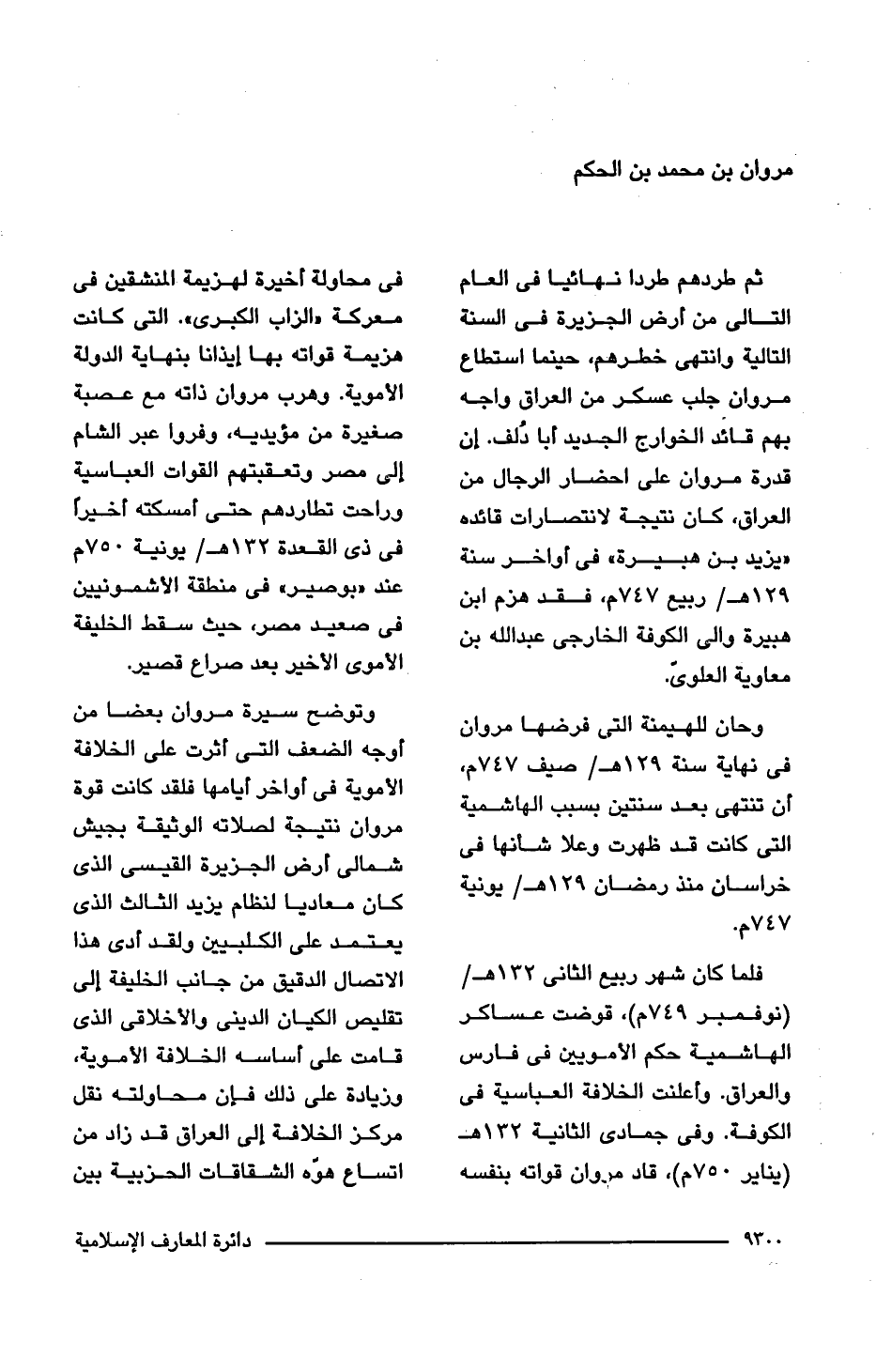 وحان للهيمنة التى فرضها مروان فى نهاية سنة 129 هـ/ صيف 747 م، أن تنتهى بعد سنتين بسبب الهاشمية التى كانت قد ظهرت وعلا شأنها فى خراسان منذ رمضان 129 هـ/ يونية 747 م.
