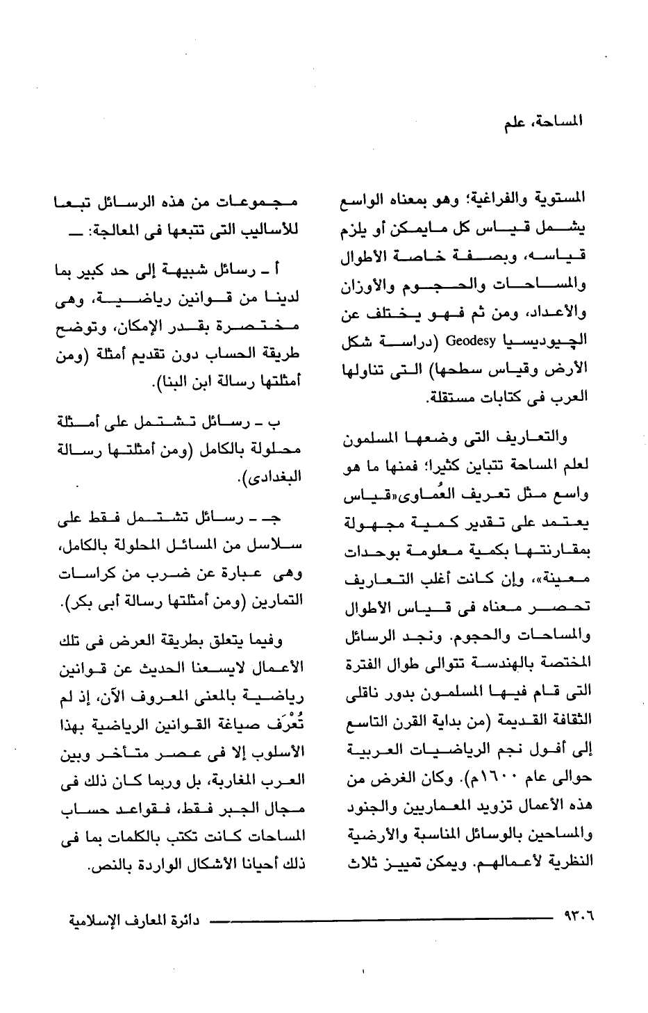 المستوية والفراغية؛ وهو بمعناه الواسع يشمل قياس كل ما يمكن أو يلزم قياسه، وبصفة خاصة الأطوال والمساحات والحجوم والأوزان والأعداد، ومن ثم فهو يختلف عن الجيوديسيا Geodesy (دراسة شكل الأرض وقياس سطحها) التى تناولها العرب فى كتابات مستقلة.