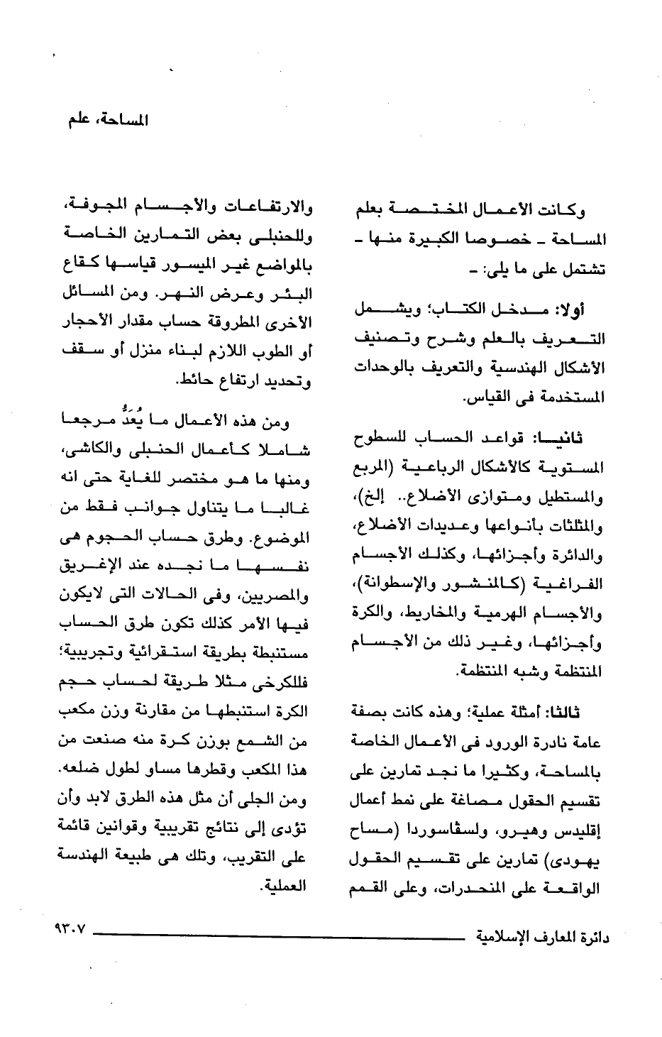 أولا: مدخل الكتاب؛ ويشمل التعريف بالعلم وشرح وتصنيف الأشكال الهندسية والتعريف بالوحدات المستخدمة فى القياس. ثانيا: قواعد الحساب للسطوح المستوية كالأشكال الرباعية (المربع والمستطيل ومتوازى الأضلاع. . إلخ)، والمثلثات بأنواعها وعديدات الأضلاع، والدائرة وأجزائها، وكذلك الأجسام الفراغية (كالمنشور والإسطوانة)، والأجسام الهرمية والمخاريط، والكرة وأجزائها، وغير ذلك من الأجسام المنتظمة وشبه المنتظمة.