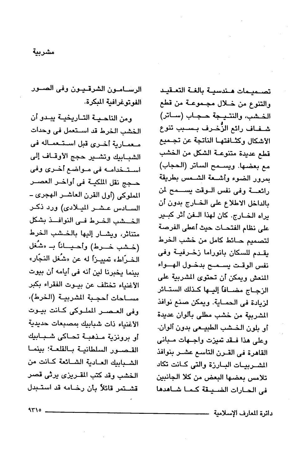 تصميمات هندسية بالغة التعقيد والتنوع من خلال مجموعة من قطع الخشب، والنتيجة حجاب (ساتر) شفاف رائع الزُّخرف بسبب تنوع الأشكال وكثافتها الناتجة عن تجميع قطع عديدة متنوعة الشكل من الخشب مع بعضها. ويسمح الساتر (الحجاب) بمرور الضوء وأشعة الشمس بطريقة رائعة وفى نفس الوقت يسمح لمن بالداخل الاطلاع على الخارج بدون أن يراه الخارج. كان لهذا الفن أثر كبير على نظام الفتحات حيث أعطى الفرصة لتصميم حائط كامل من خشب الخرط يقدم للسكان بانوراما زخرفية وفى نفس الوقت يسمح بدخول الهواء المنعش ويمكن أن تحتوى المشربية على الزجاج مضافًا إليها كذلك الستائر لزيادة فى الحماية. ويمكن صنع نوافذ المشربية من خشب مطلى بألوان عديدة أو بلون الخشب الطبيعى بدون ألوان. وعلى هذا فقد تميزت واجهات مبانى القاهرة فى القرن التاسع عشر بنوافذ المشربيات البارزة والتى كانت تكاد تلامس بعضها البعض من كلا الجانبين فى الحارات الضيقة كما شاهدها الرسامون الشرقيون وفى الصور الفوتوغرافية المبكرة.