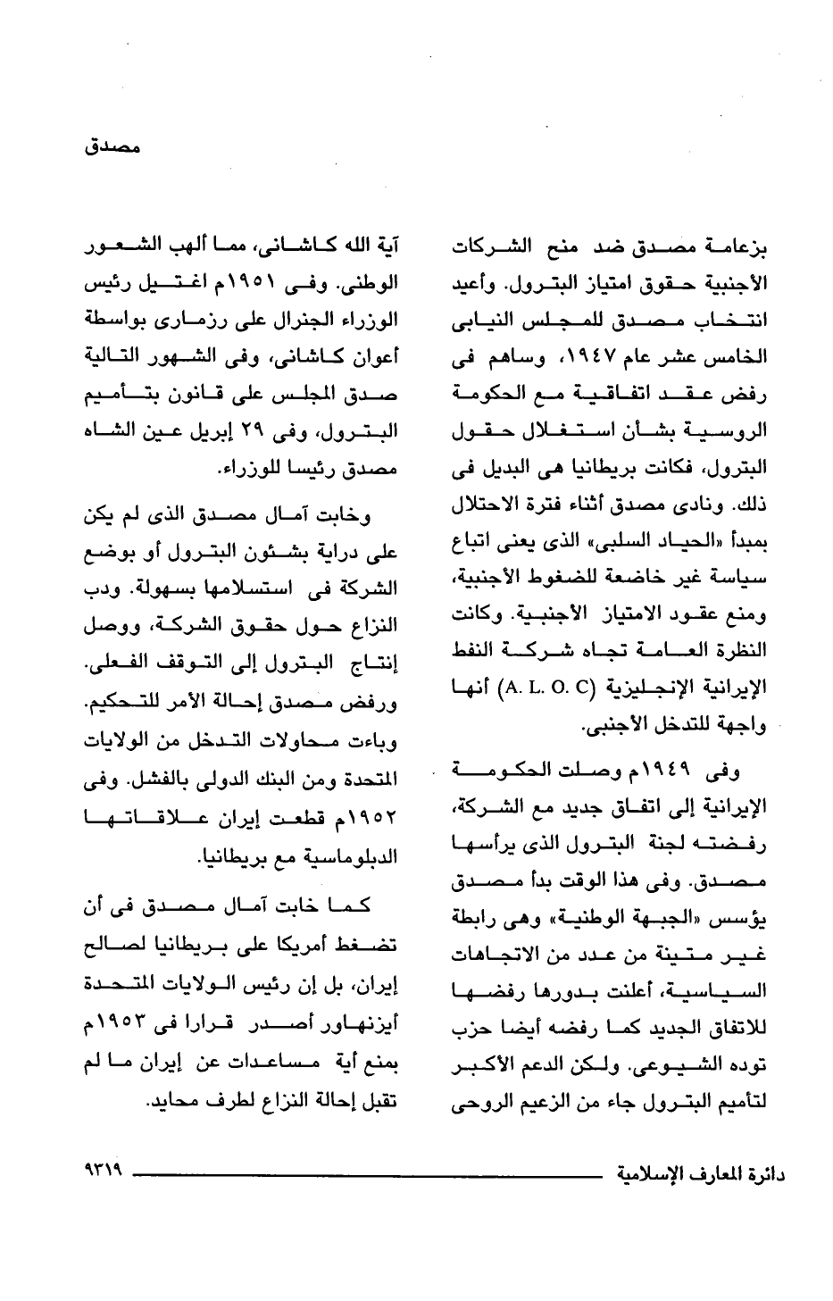 بزعامة مصدق ضد منح الشركات الأجنبية حقوق امتياز البترول. وأعيد انتخاب مصدق للمجلس النيابى الخامس عشر عام 1947، وساهم فى رفض عقد اتفاقية مع الحكومة الروسية بشأن استغلال حقول البترول، فكانت بريطانيا هى البديل فى ذلك. ونادى مصدق أثناء فترة الاحتلال بمبدأ "الحياد السلبى" الذى يعنى اتباع سياسة غير خاضعة للضغوط الأجنبية، ومنع عقود الامتياز الأجنبية. وكانت النظرة العامة تجاه شركة النفط الإيرانية الانجليزية (A. L. O. C) أنها واجهة للتدخل الأجنبى.