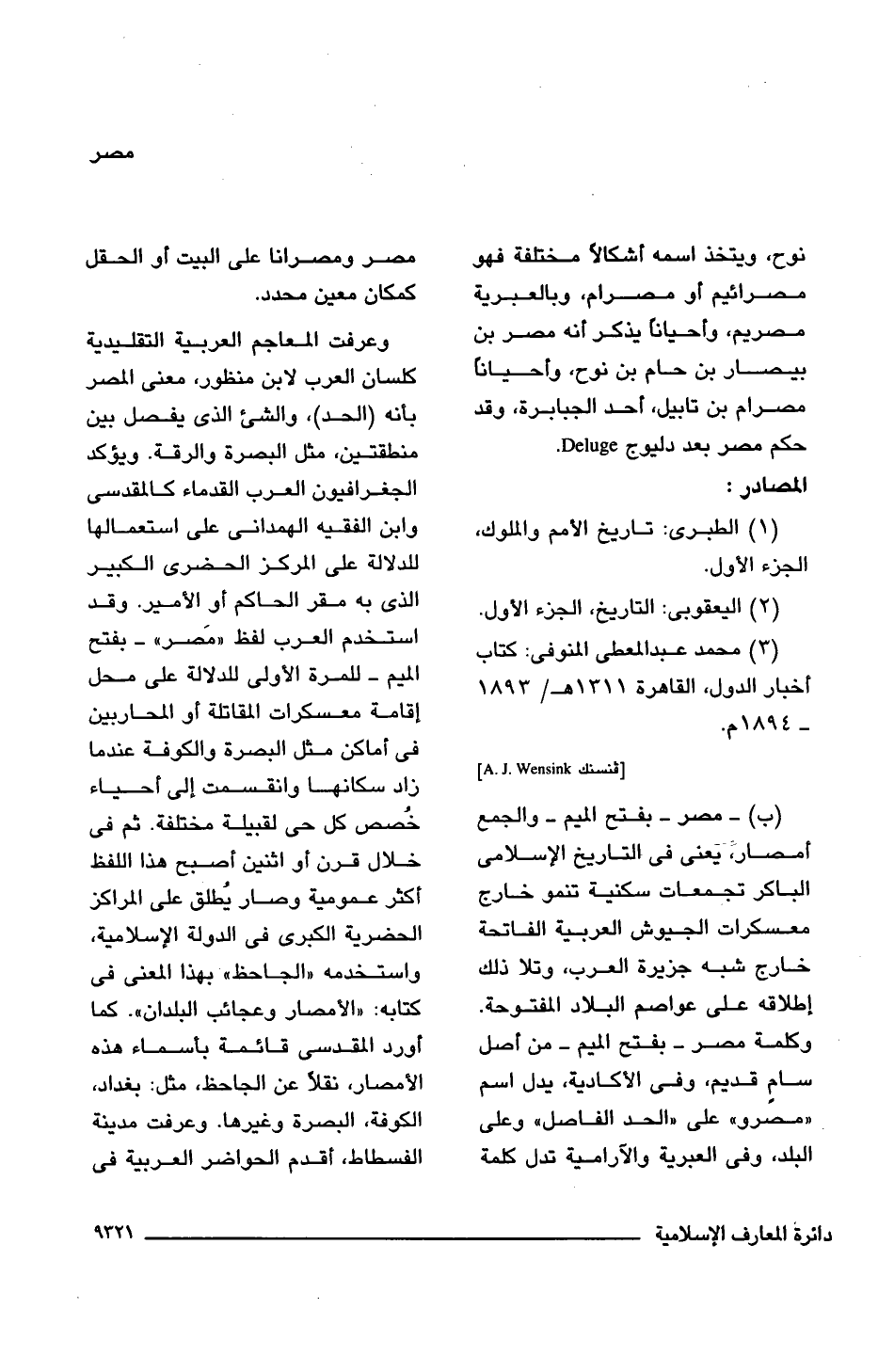 (ب) - مصر - بفتح الميم- والجمع أمصار يعنى فى التاريخ الإسلامى الباكر تجمعات سكنية تنمو خارج معسكرات الجيوش العربية الفاتحة خارج شبه جزيرة العرب، وتلا ذلك إطلاقه على عواصم البلاد المفتوحة. وكلمة مصر -بفتح الميم- من أصل سامٍ قديم، وفى الأكادية، يدل اسم "مصرو" على "الحد الفاصل" وعلى البلد، وفى العبرية والآرامية تدل كلمة مصر ومصرانا على البيت أو الحقل كمكان معين محدد.