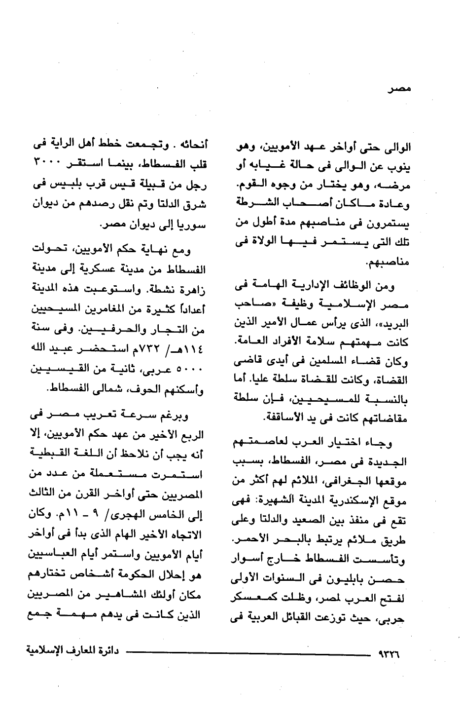 وبرغم سرعة تعريب مصر فى الربع الأخير من عهد حكم الأمويين، إلا أنه يجب أن نلاحظ أن اللغة القبطية استمرت مستعملة من عدد من المصريين حتى أواخر القرن من الثالث إلى الخامس الهجرى/ 9 - 11 م. وكان الاتجاه الأخير الهام الذى بدأ فى أواخر أيام الأمويين واستمر أيام العباسيين هو إحلال الحكومة أشخاص تختارهم مكان أولئك المشاهير من المصريين الذين كانت فى يدهم مهمة جمع