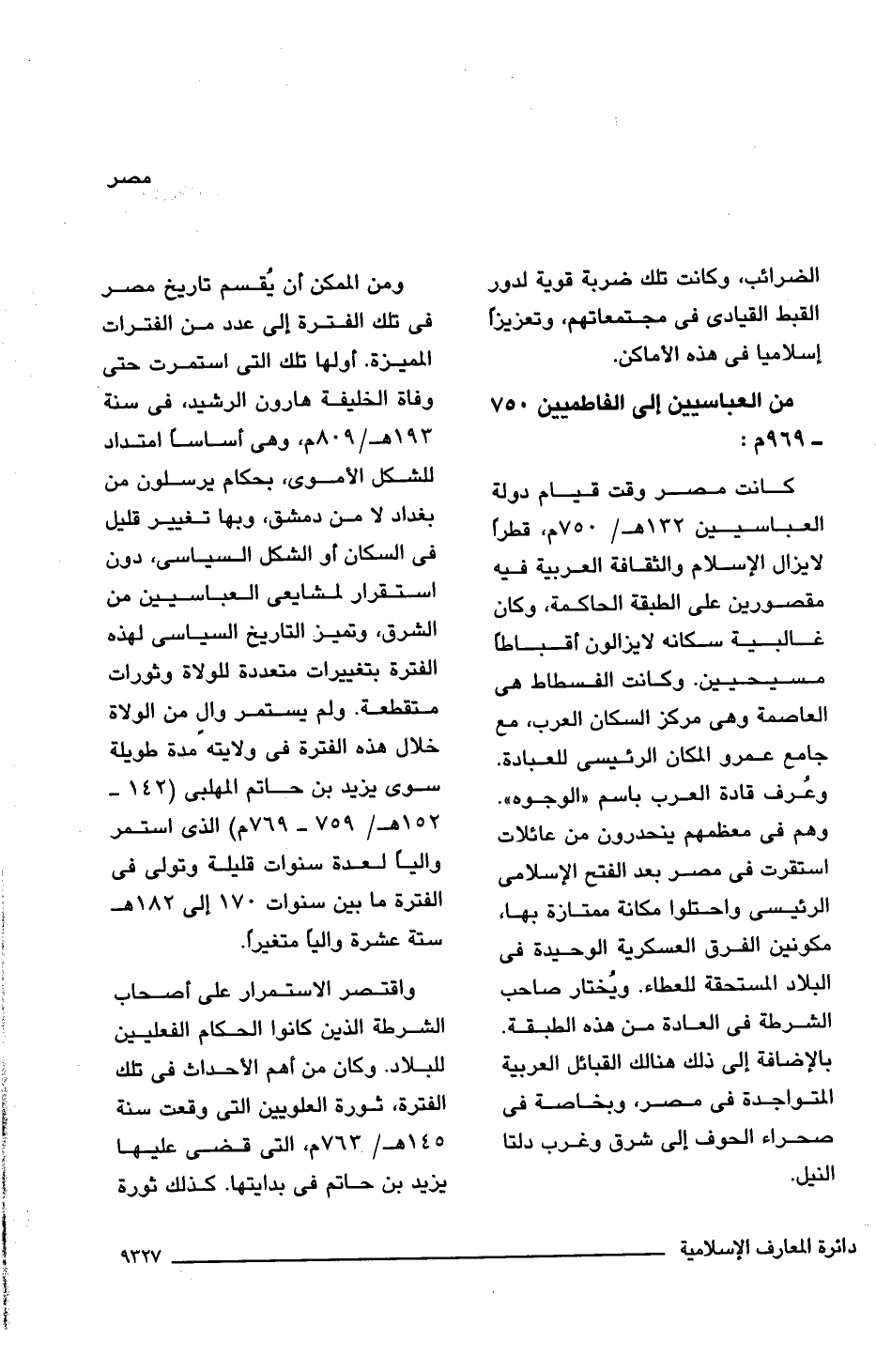 ومن الممكن أن يُقسم تاريخ مصر فى تلك الفترة إلى عدد من الفترات المميزة. أولها تلك التى استمرت حتى وفاة الخليفة هارون الرشيد، فى سنة 193 هـ/ 809 م، وهى أساسًا امتداد للشكل الأموى، بحكام يرسلون من بغداد لا من دمشق، وبها تغيير قليل فى السكان أو الشكل السياسى، دون استقرار لمشايعى العباسيين من الشرق، وتميز التاريخ السياسى لهذه الفترة بتغييرات متعددة للولاة وثورات متقطعة. ولم يستمر والٍ من الولاة خلال هذه الفترة فى ولايته مدة طويلة سوى يزيد بن حاتم المهلبى (142 - 152 هـ/ 759 - 769 م) الذى استمر واليًا لعدة سنوات قليلة وتولى فى الفترة ما بين سنوات 170 إلى 182 هـ ستة عشرة واليًا متغيرًا.