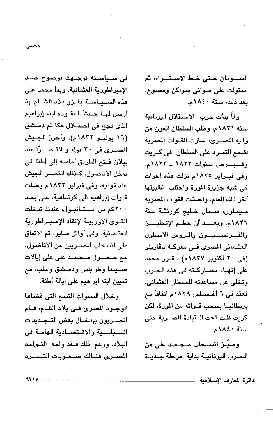 ولمَّا بدأت حرب الاستقلال اليونانية سنة 1821 م، وطلب السلطان العون من واليه المصرى، سارت القوات المصرية لقمع التمرد على السلطان فى كريت وقبرص سنوات 1822 - 1823 م. وفى فبراير 1825 م نزلت هذه القوات فى شبه جزيرة المورة واحتلت غالبيتها آخر ذلك العام. واحتلت القوات المصرية ميسلون، شمال خليج كورنثة سنة 1826 م. وبعد أن حطم الإنجليز والفرنسيون والروس الأسطول العثمانى المصرى فى معركة نافارينو (فى 20 أكتوبر 1827 م)، قرر محمد على إنهاء مشاركته فى هذه الحرب وتخلى عن مساعدته للسلطان العثمانى، فعقد فى 6 أغسطس 1828 م اتفاقًا مع بريطانيا بسحب قواته من المورة، لكن كريت ظلت تحت القيادة المصرية حتى سنة 1840 م.