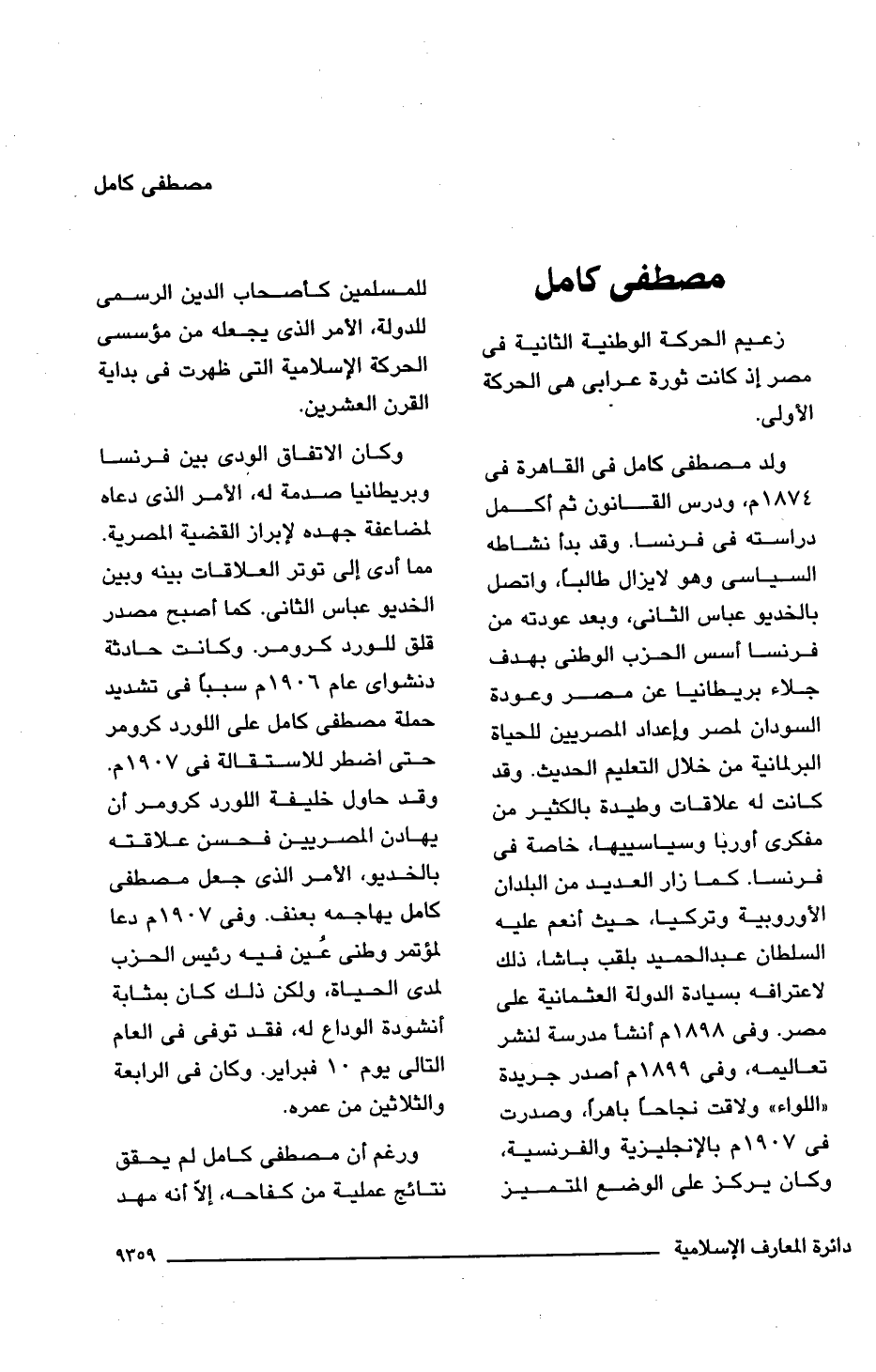 ولد مصطفى كامل فى القاهرة فى 1874 م، ودرس القانون ثم أكمل دراسته فى فرنسا. وقد بدأ نشاطه السياسى وهو لا يزال طالبًا، واتصل بالخديو عباس الثانى، وبعد عودته من فرنسا أسس الحزب الوطنى بهدف جلاء بريطانيا عن مصر وعودة السودان لمصر وإعداد المصريين للحياة البرلمانية من خلال التعليم الحديث. وقد كانت له علاقات وطيدة بالكثير من مفكرى أوربا وسياسييها، خاصة فى فرنسا. كما زار العديد من البلدان الأوربية وتركيا، حيث أنعم عليه السلطان عبد الحميد بلقب باشا، ذلك لاعترافه بسيادة الدولة العثمانية على مصر. وفى 1898 م أنشأ مدرسة لنشر تعاليمه، وفى 1899 م أصدر جريدة "اللواء" ولاقت نجاحًا باهرًا، وصدرت فى 1907 م بالانجليزية والفرنسية، وكان يركز على الوضع المتميز للمسلمين كأصحاب الدين الرسمى للدولة، الأمر الذى يجعله من مؤسسى الحركة الإسلامية التى ظهرت فى بداية القرن العشرين.
