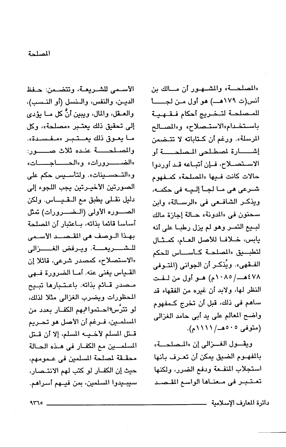 "المصلحة", والمشهور أن مالك بن أنس (ت 179 هـ) هو أول من لجأ للمصلحة لتخريج أحكام فقهية باستخدام "الاستصلاح" و"المصالح المرسلة". ورغم أن كتاباته لا تتضمن إشارة لمصطلحى المصلحة أو الاستصلاح، فإن أتباعه قد أوردوا حالات كانت فيها "المصلحة" كمفهوم شرعى هى ما لجأ إليه فى حكمه، ويذكر الشافعى فى "الرسالة" وابن سحنون فى "المدونة" حالة إجازة مالك لبيع التمر وهو لم يزل رطبا على أنه يابس، خلافا للأصل العام، كمثال لتطبيق "المصلحة كأساس للحكم الفقهى". ويُذكر أن الجوانى (المتوفى 478 هـ/ 1085 م) هو أول من لفت النظر لها، ولابد أن غيره من الفقهاء قد ساهم فى ذلك، قبل أن تخرج كمفهوم واضح المعالم على يد أبى حامد الغزالى (متوفى 505 هـ/ 1111 م).