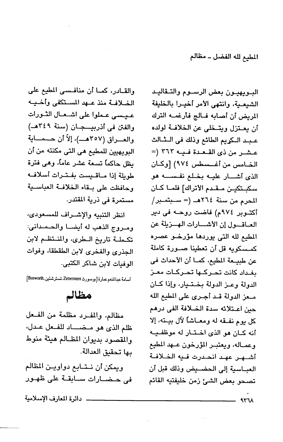 البويهيون بعض الرسوم والتقاليد الشيعية، وانتهى الأمر أخيرا بالخليفة المريض أن أصابه فالج فأرغمه الترك أن يعتزل ويتخلى عن الخلافة لولده عبد الكريم الطائع وذلك فى الثالث عشر من ذى القعدة فيه 363 (= الخامس من أغسطس 974) [وكان الذى أشار عليه بخلع نفسه هو سكبتكين مقدم الأتراك] فلما كان المحرم من سنة 264 هـ (= سبتمبر/ أكتوبر 974 م) فاضت روحه فى دير العاقول إن الأشارات الهزيلة عن المطيع للَّه التى يوردها مؤرخو عصره كمسكويه قل أن تعطينا صورة كاملة عن طبيعة المطيع، كما أن الأحداث فى بغداد كانت تحركها تحركات معز الدولة وعز الدولة بختيار، وإذا كان معز الدولة قد أجرى على المطيع اللَّه حين اعتلائه سدة الخلافة الفى دره كل يوم نفقه له ومعاشًا لآل بيته، إلا أنه كان هو الذى اختار له موظفيه وعماله، ويعتبر المؤرخون عهد المطيع أشهر عهد انحدرت فيه الخلافة العباسية إلى الحضيض وذلك قبل أن تصحو بعض الشئ زمن خليفتيه القائم والقادر، كما أن منافسى المطيع على الخلافة منذ عهد المستكفى وأخيه عيسى عملوا على اشعال الثورات والفتن فى أذربيجان (سنة 349 هـ) والعراق (357 هـ)، إلّا أن حماية البويهيين للمطيع هى التى مكنته من أن يظل حاكما تسعة عشر عامًا، وهى فترة طويلة إذا ما قيست بفترات أسلافه وحافظت على بقاء الخلافة العباسية مستمرة فى ذرية المقتدر.