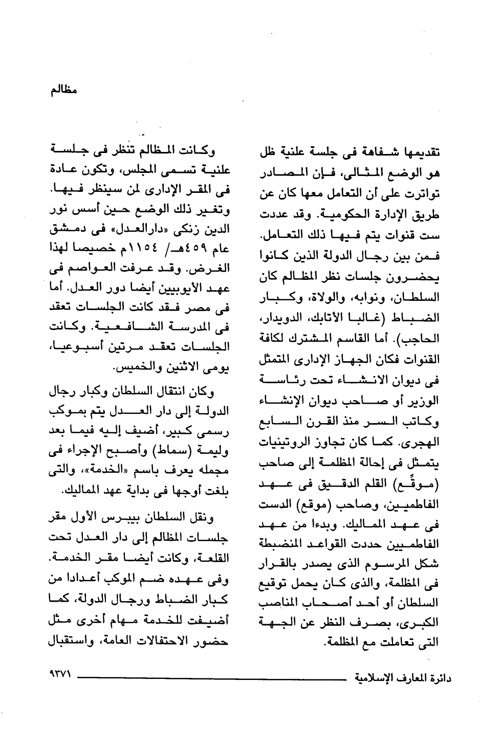 وكانت المظالم تنظر فى جلسة علنية تسمى المجلس، وتكون عادة فى المقر الإدارى لمن سينظر فيها. وتغير ذلك الوضع حين أسس نور الدين زنكى "دار العدل" فى دمشق عام 459 هـ/ 1154 م خصيصا لهذا الغرض. وقد عرفت العواصم فى عهد الأيوبيين أيضا دور العدل. أما فى مصر فقد كانت الجلسات تعقد فى المدرسة الشافعية. وكانت الجلسات تعقد مرتين أسبوعيا، يوص الاثنين والخميس.