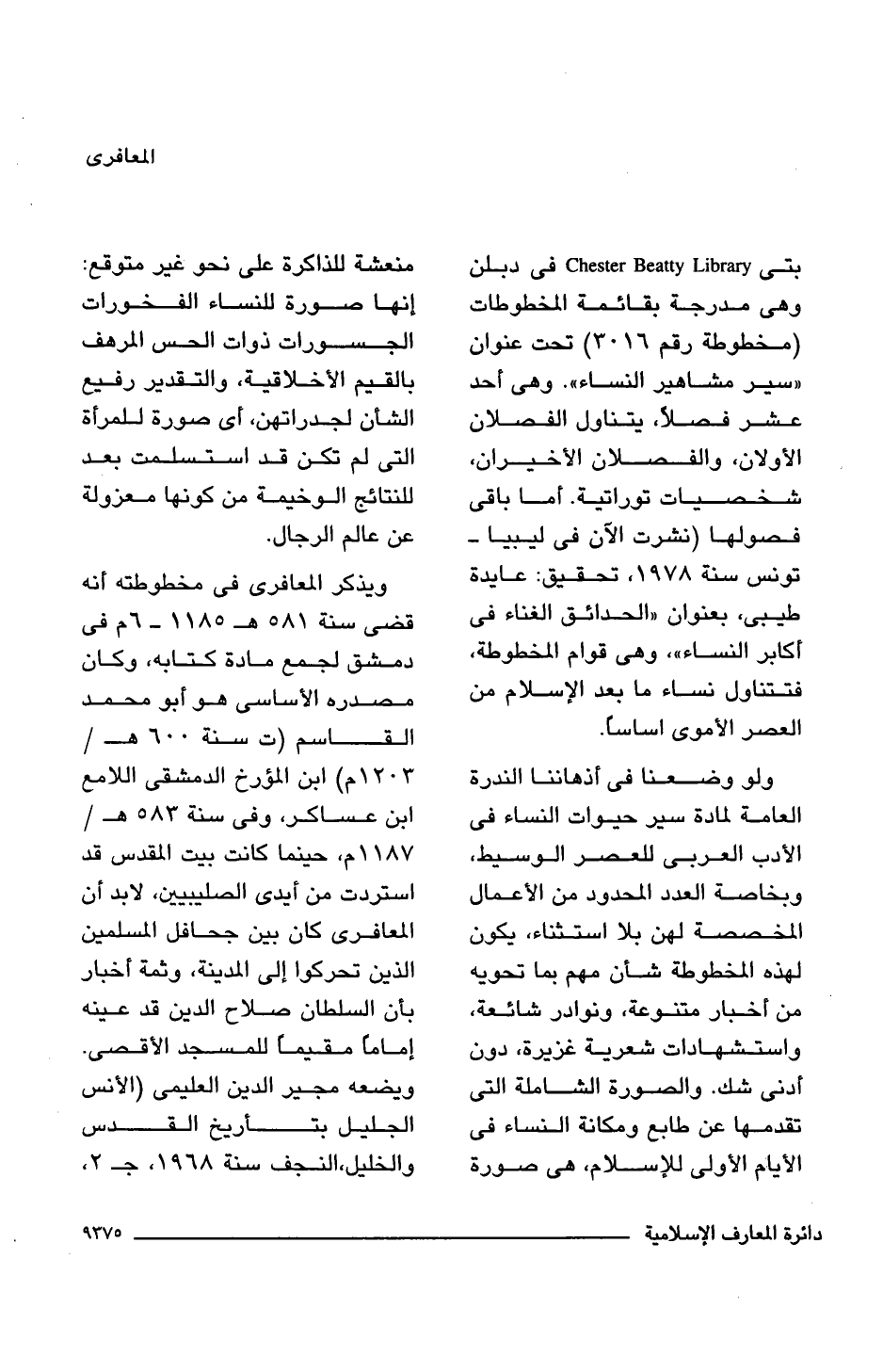 ولو وضعنا فى أذهاننا الندرة العامة لمادة سير حيوات النساء فى الأدب العربى للعصر الوسيط، وبخاصة العدد المحدود من الأعمال المخصصة لهن بلا استثناء، يكون لهذه المخطوطة شأن مهم بما تحويه من أخبار متنوعة، ونوادر شائعة، واستشهادات شعرية غزيرة، دون أدنى شك. والصورة الشاملة التى تقدمها عن طابع ومكانة النساء فى الأيام الأولى للإسلام، هى صورة منعشة للذاكرة على نحو غير متوقع: إنها صورة للنساء الفخورات الجسورات ذوات الحس المرهف بالقيم الأخلاقية، والتقدير رفيع الشأن لجدراتهن، أى صورة للمرأة التى لم تكن قد استسلمت بعد للنتائج الوخيمة من كونها معزولة عن عالم الرجال.