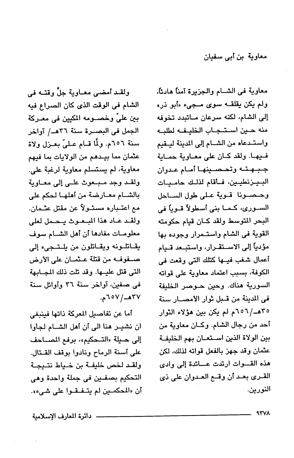ولقد أمضى معاوية جلَّ وقته فى الشام فى الوقت الذى كان الصراع فيه بين على وخصومه المكيين فى معركة الجمل فى البصرة سنة 36 هـ/ أواخر سنة 656 م. ولمَّا قام علىّ بعزل ولاة عثمان مما بيدهم من الولايات بما فيهم معاوية، لم يستسلم معاوية لرغبة على. ولقد وجد مبعوث على إلى معاوية بالشام معارضة من أهلها لحكم على مع اعتباره مسئولًا عن مقتل عثمان. ولقد عاد هذا المبعوث يحمل لعلى معلومات مفادها أن أهل الشام سوف يقاتلونه ويقاتلون من يلتجئ إلى صفوفه من قتلة عثمان على الأرض التى قتل عليها. وقد تلت ذلك المجابهة فى صفين، آواخر سنة 36 وأوائل سنة 37 هـ/ 657 م.